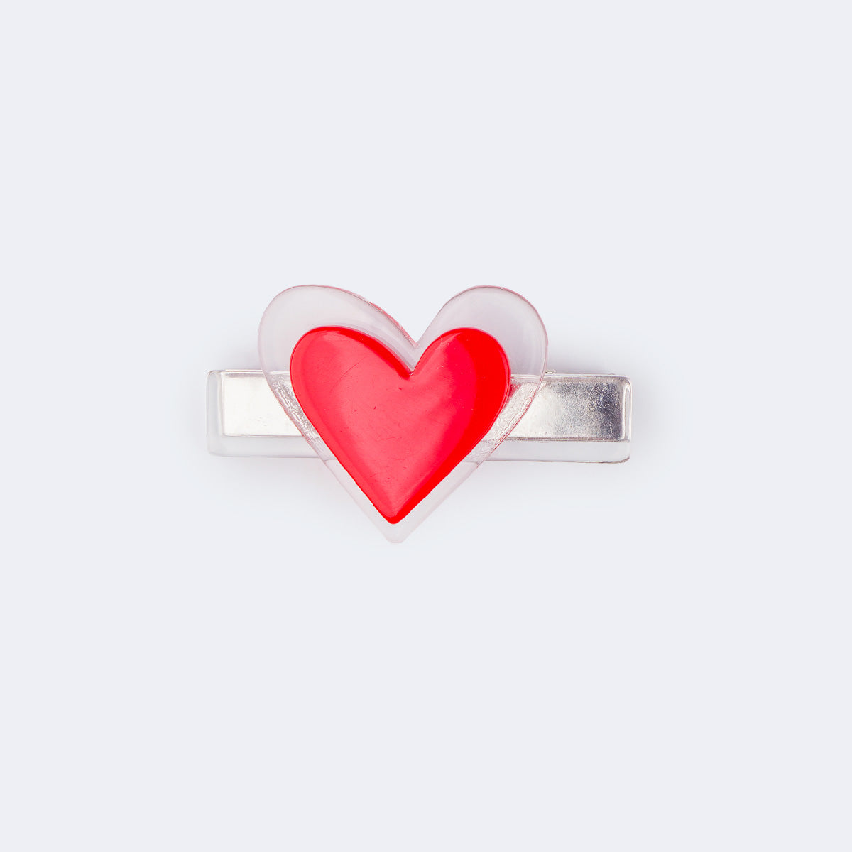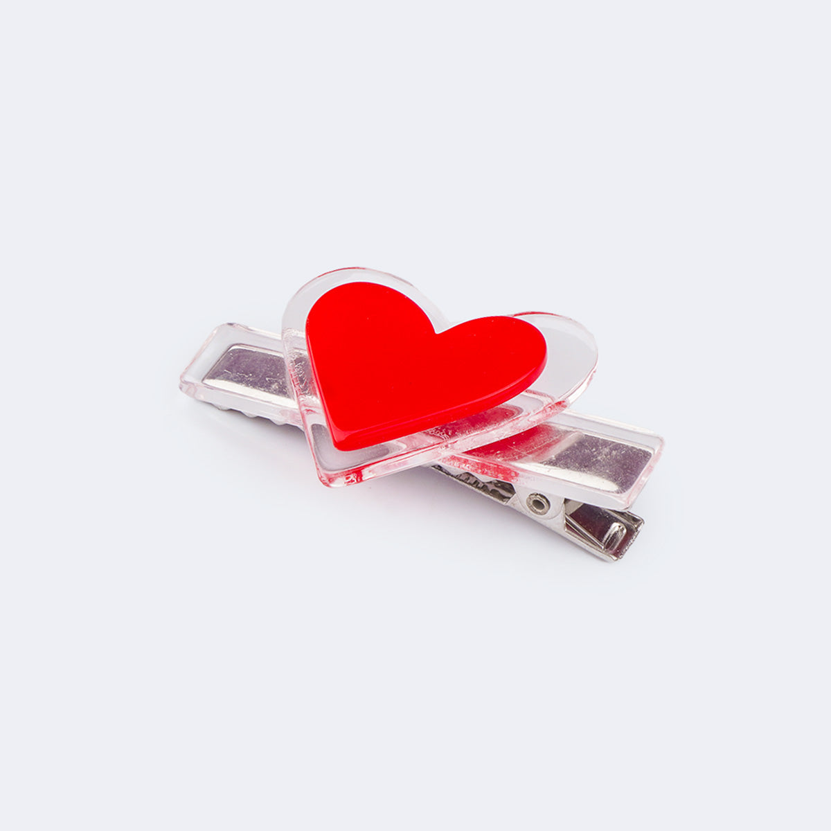 Presilha de cabelo infantil com coração vermelho e transparente em acrílico, versátil para o dia a dia! Bico de pato em metal prateado, resistente e fácil de colocar!