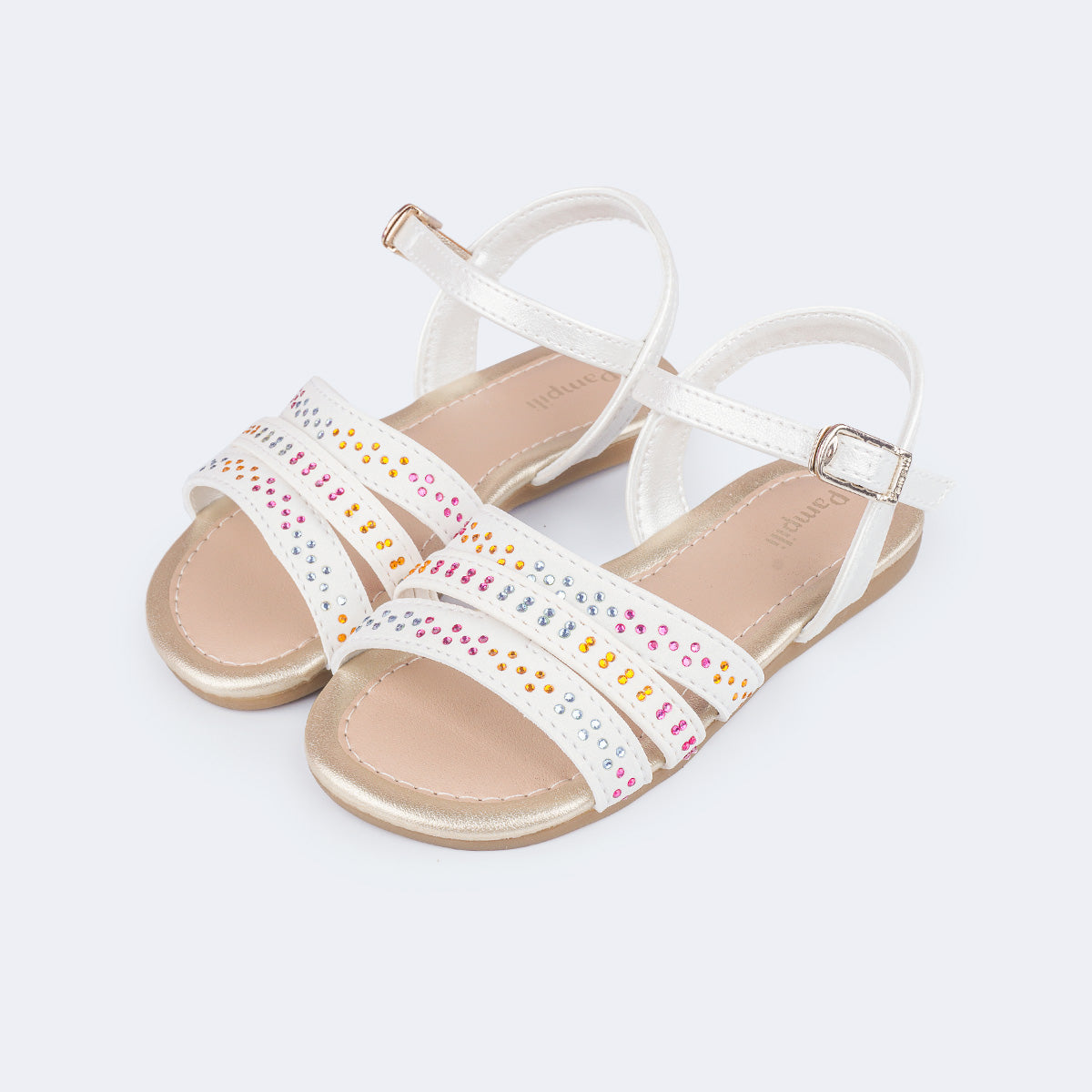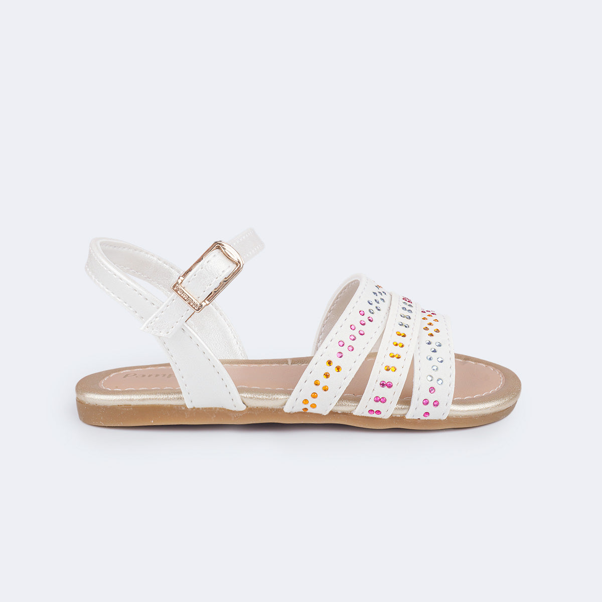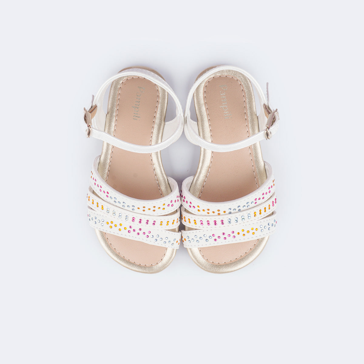 A sandália Mili é puro encanto! Em tom branco suave, traz tiras delicadas adornadas por strass coloridos em tons de rosa, azul e laranja, que refletem brilho sutil ao caminhar.