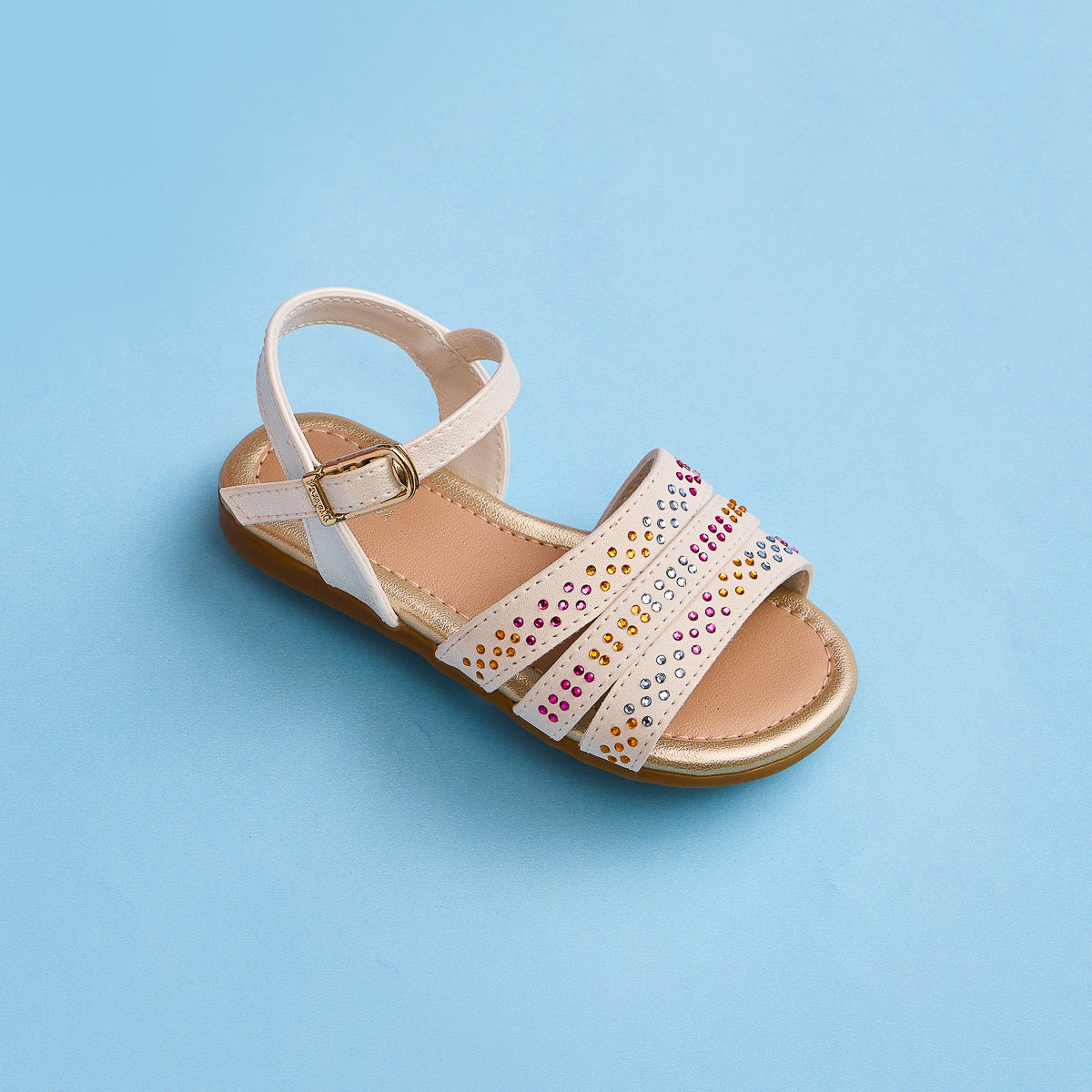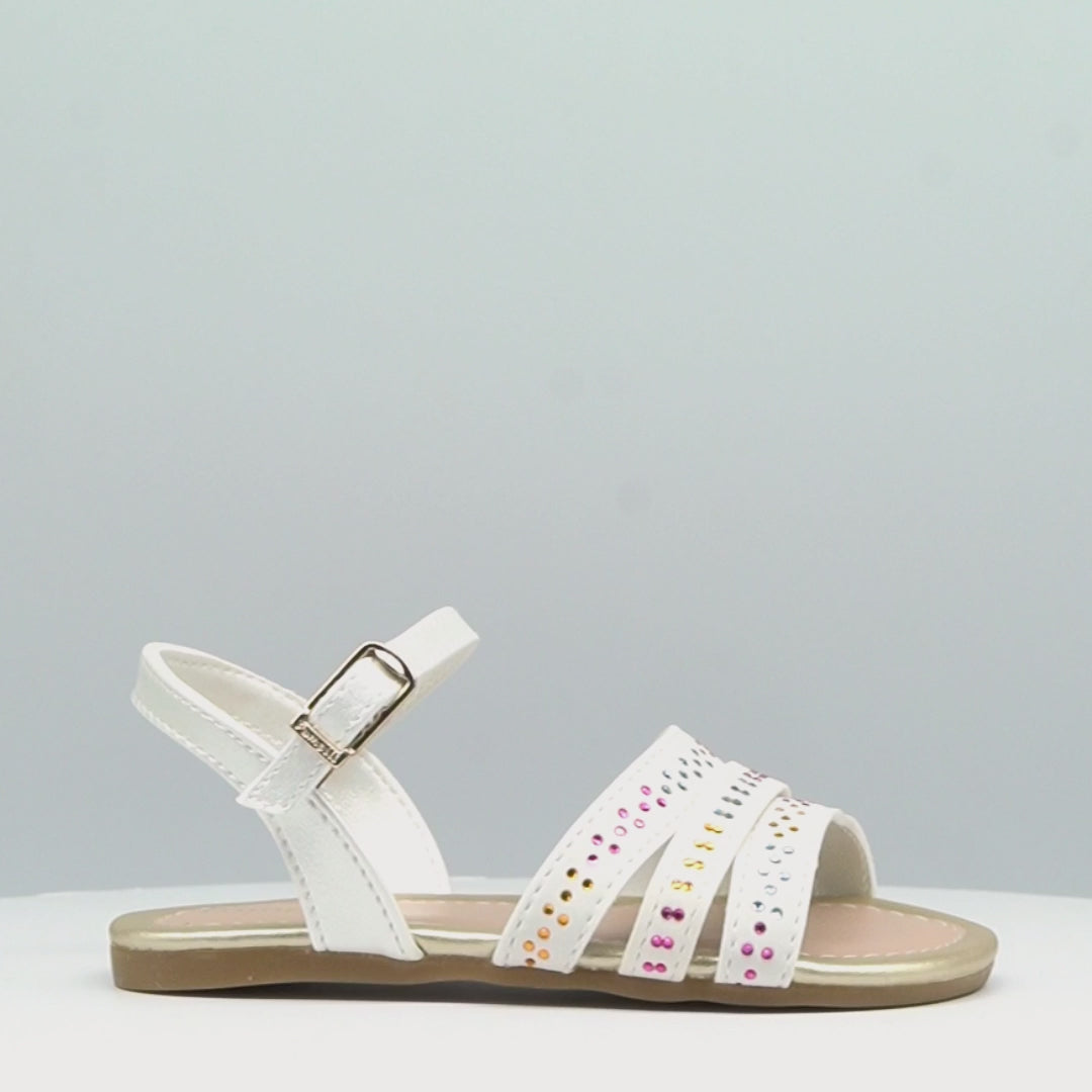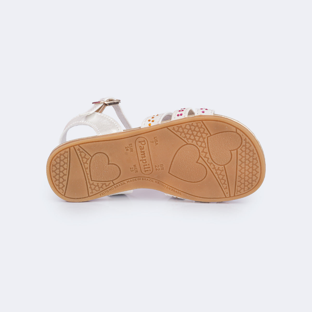 A sandália Mili é puro encanto! Em tom branco suave, traz tiras delicadas adornadas por strass coloridos em tons de rosa, azul e laranja, que refletem brilho sutil ao caminhar.