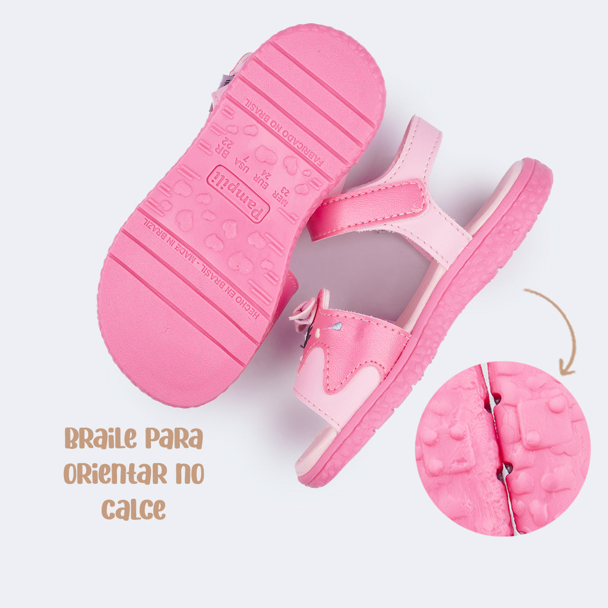 Além disso, o modelo traz detalhe em braile no solado, incentivando a inclusão. O cabedal lúdico é adornado com lacinho fixo e bordados delicados que deixam o visual ainda mais fofo!