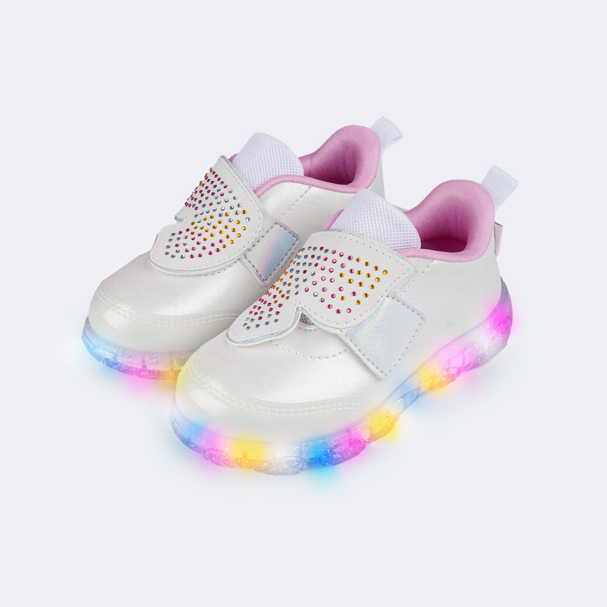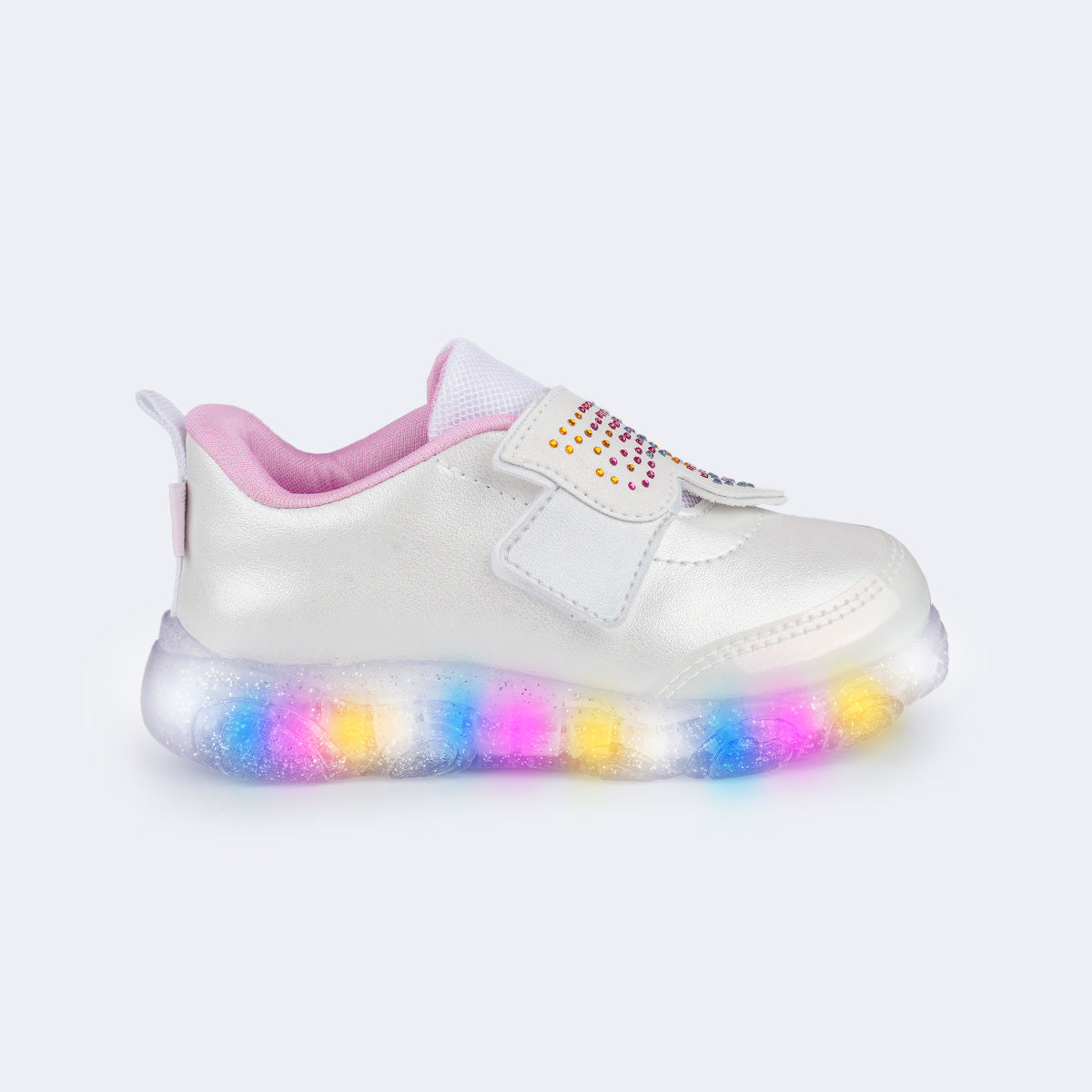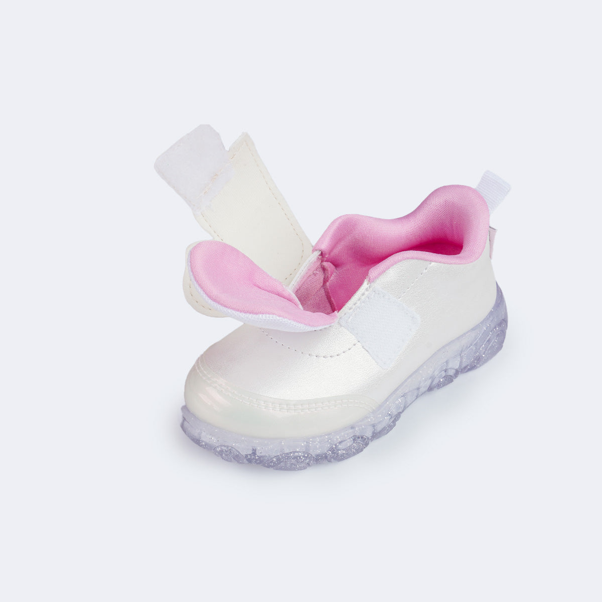 O tênis infantil branco perolado da linha mini é pura diversão com seu solado transparente cheio de glitter e luzes de LED coloridas que acendem a cada movimento, deixando cada passinha da menina ainda mais divertido.
