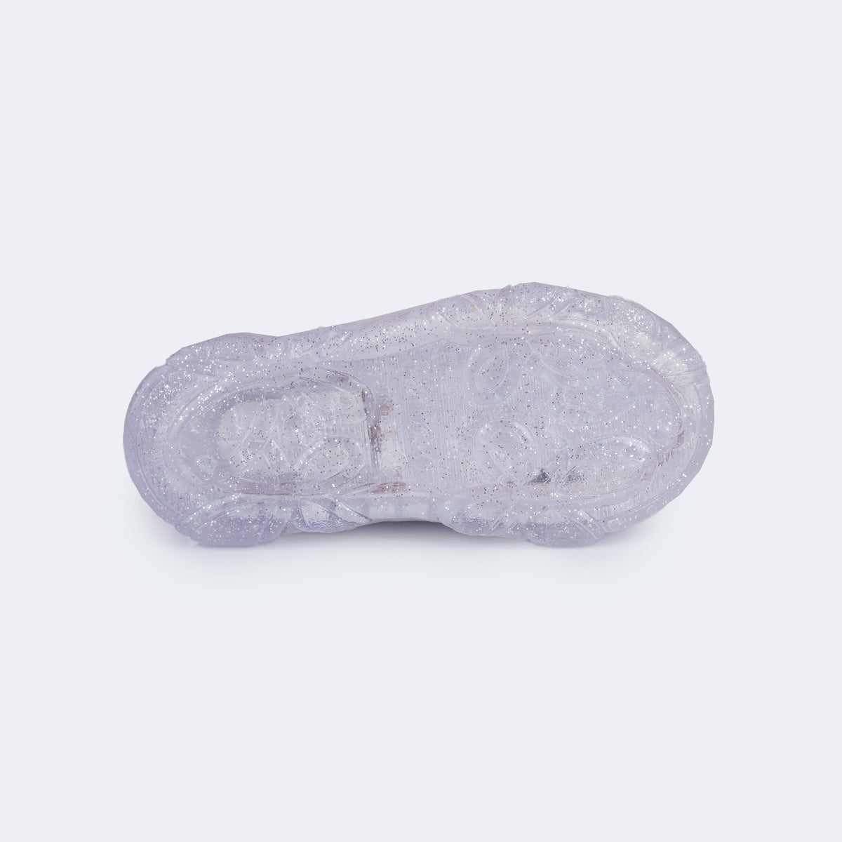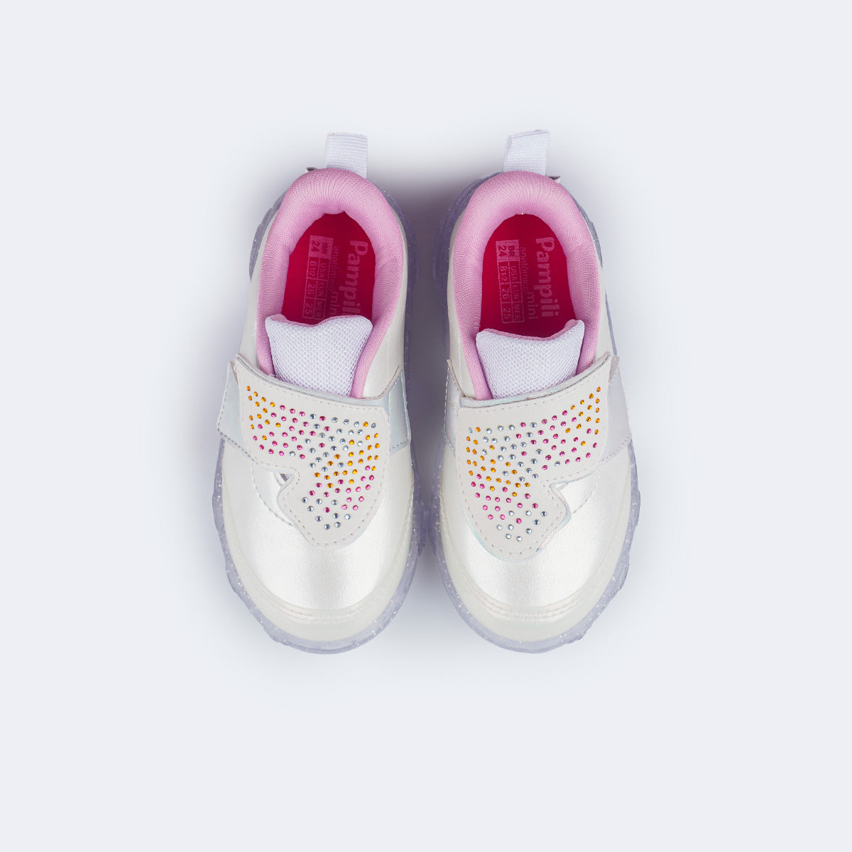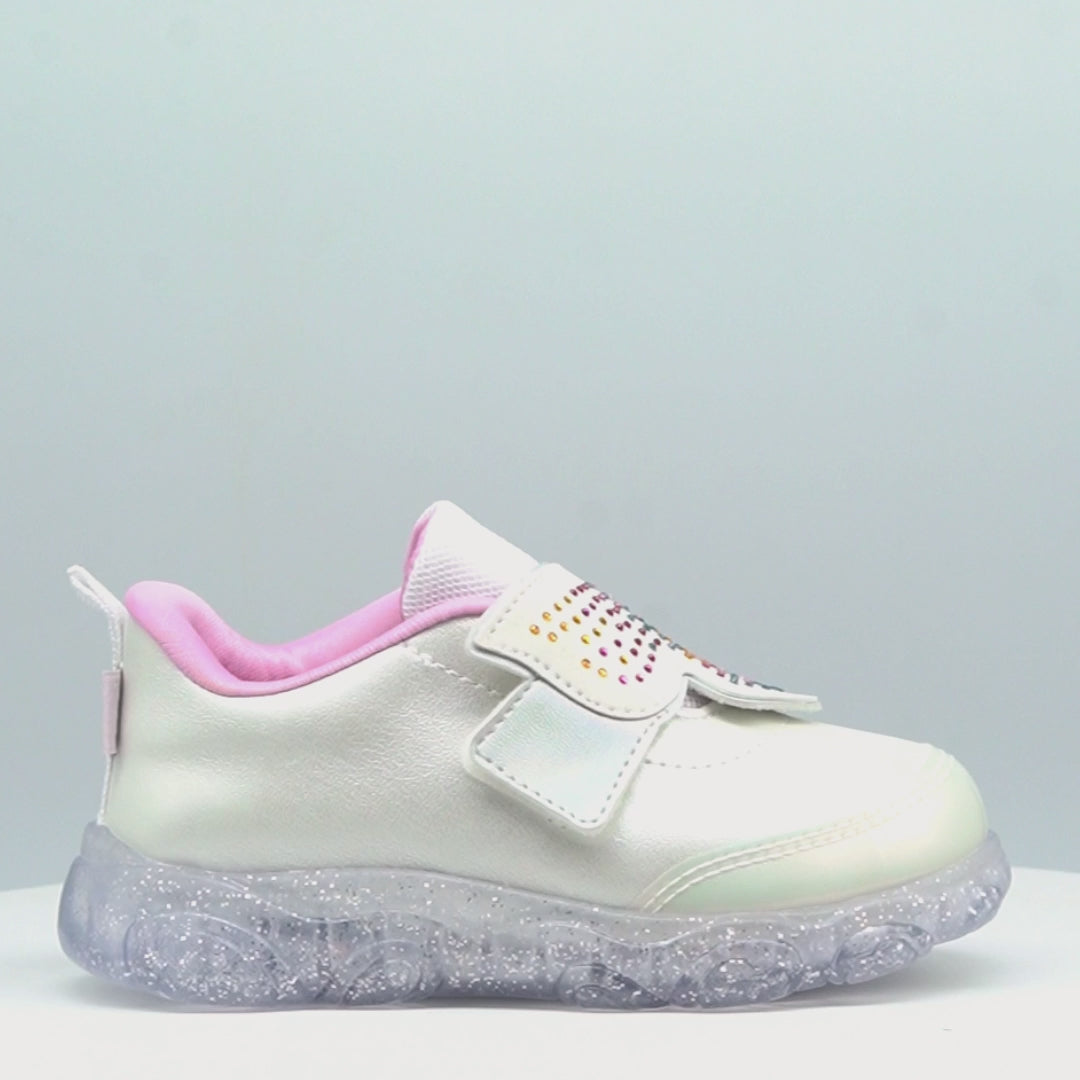 O tênis infantil branco perolado da linha mini é pura diversão com seu solado transparente cheio de glitter e luzes de LED coloridas que acendem a cada movimento, deixando cada passinha da menina ainda mais divertido.