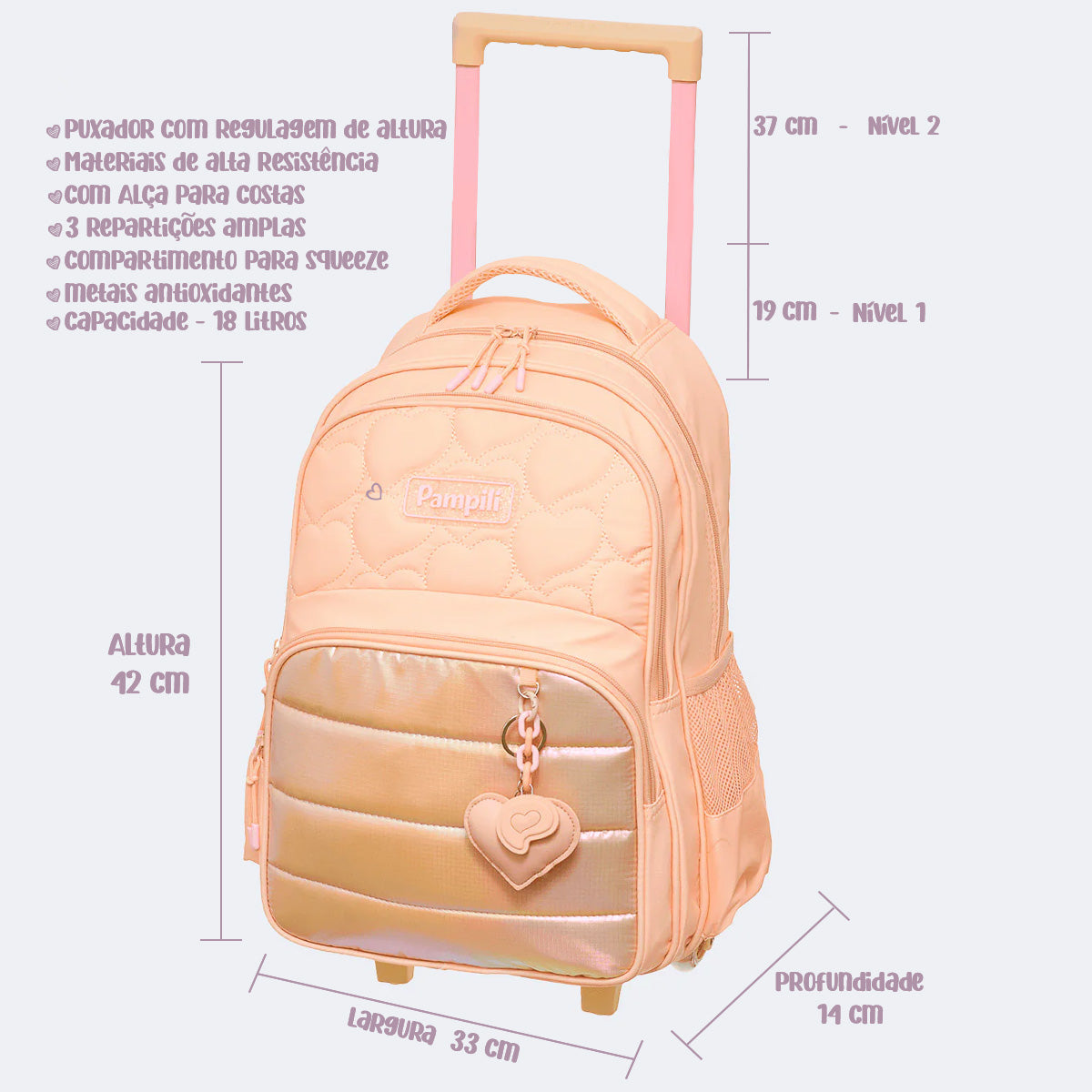 Mochila de rodinhas infantil escolar salmão com tecido comfy holográfico e costuras em formato de corações. Projetada para desempenho e durabilidade no dia a dia escolar, esta mochila oferece capacidade total de 18 litros, com estrutura resistente suportando até 5 kg de materiais. Fabricada em poliéster de alta densidade (300D), o modelo garante excelente performance em uso contínuo. A versão com rodinhas é equipada com carrinho em alumínio e puxador com regulagem de altura, que facilita o transporte e acompanha o crescimento das meninas.