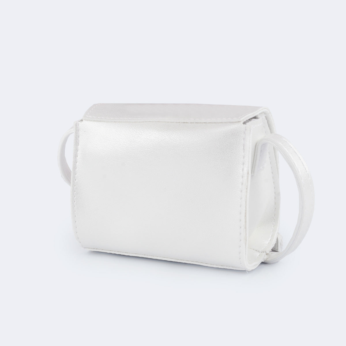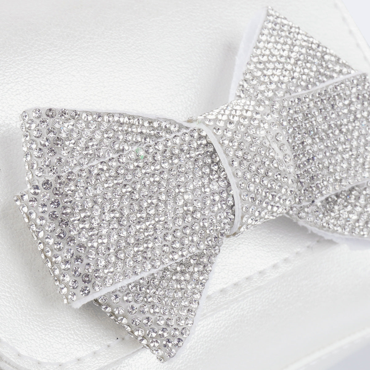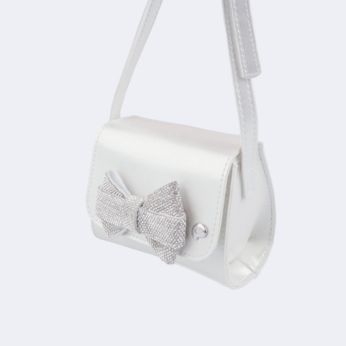 Mini bolsa branca infantil com laço frontal todo aplicado em mini strass. O design compacto com alça de ombro regulável deixa o acessório prático e perfeito para acompanhar as pequenas em celebrações e momentos especiais.