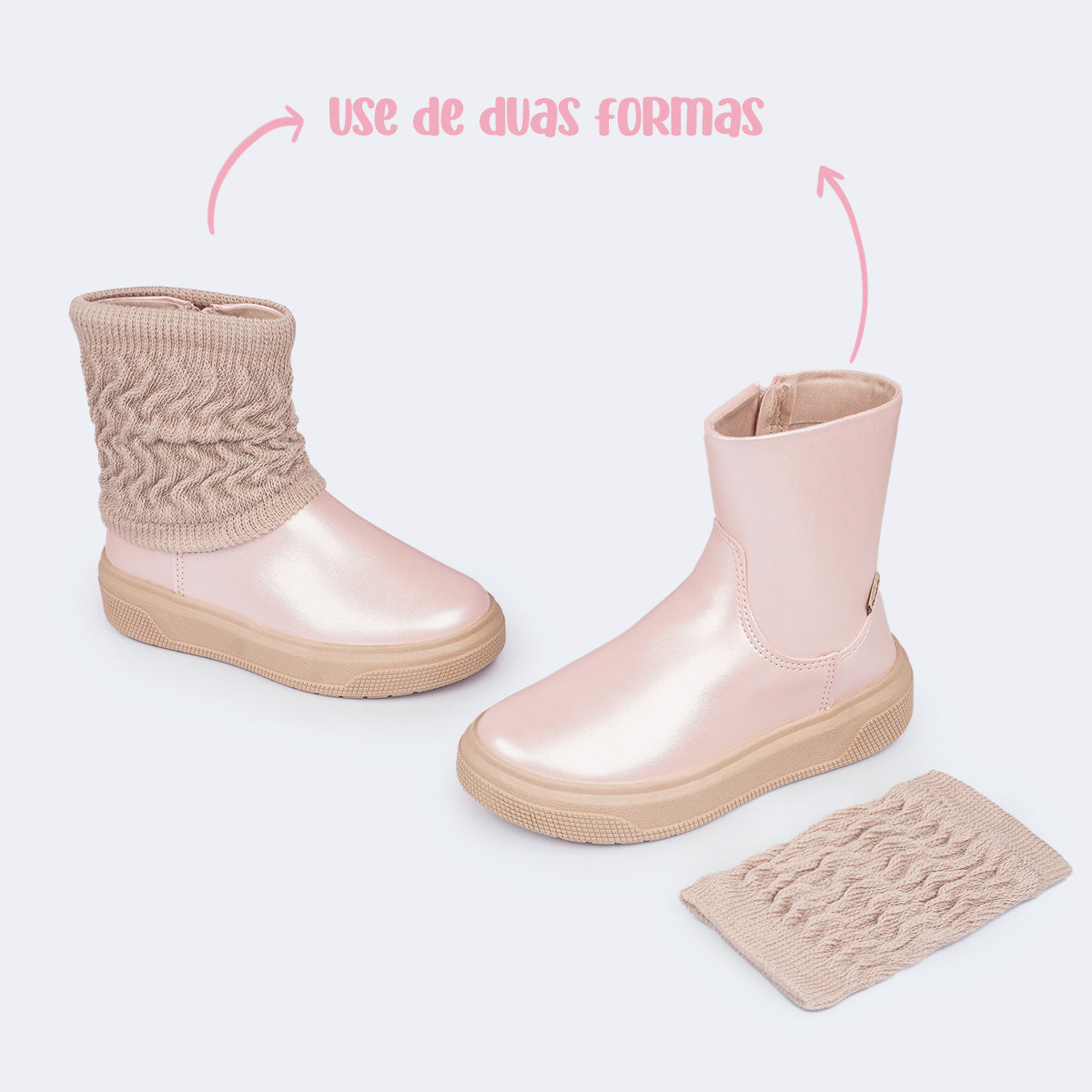 Do básico ao fashion em um toque, essa bota rosa perolada trás dois estilos em um só par. Com a polaina rosa removível, a menina cria um acabamento mais “inverninho” e sem a polaina, fica uma botinha clean e casual, pronta para combinar com diferentes peças do guarda-roupa da menina.