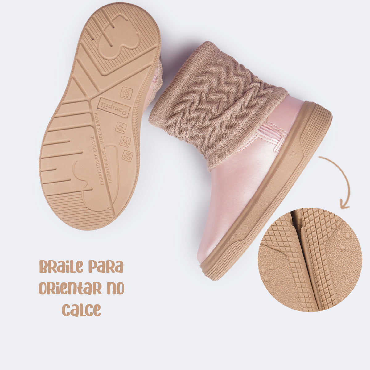 Pensada para conforto e praticidade, esse produto tem material liso de fácil limpeza, fecho de correr para um calce fácil, forro absorvente e palmilha anatômica com tecnologia Feet Care com maior amortecimento para mais bem-estar. O solado caixa antiderrapante garante firmeza a cada passo e a identificação em braile no solado reforça o cuidado com a inclusão.