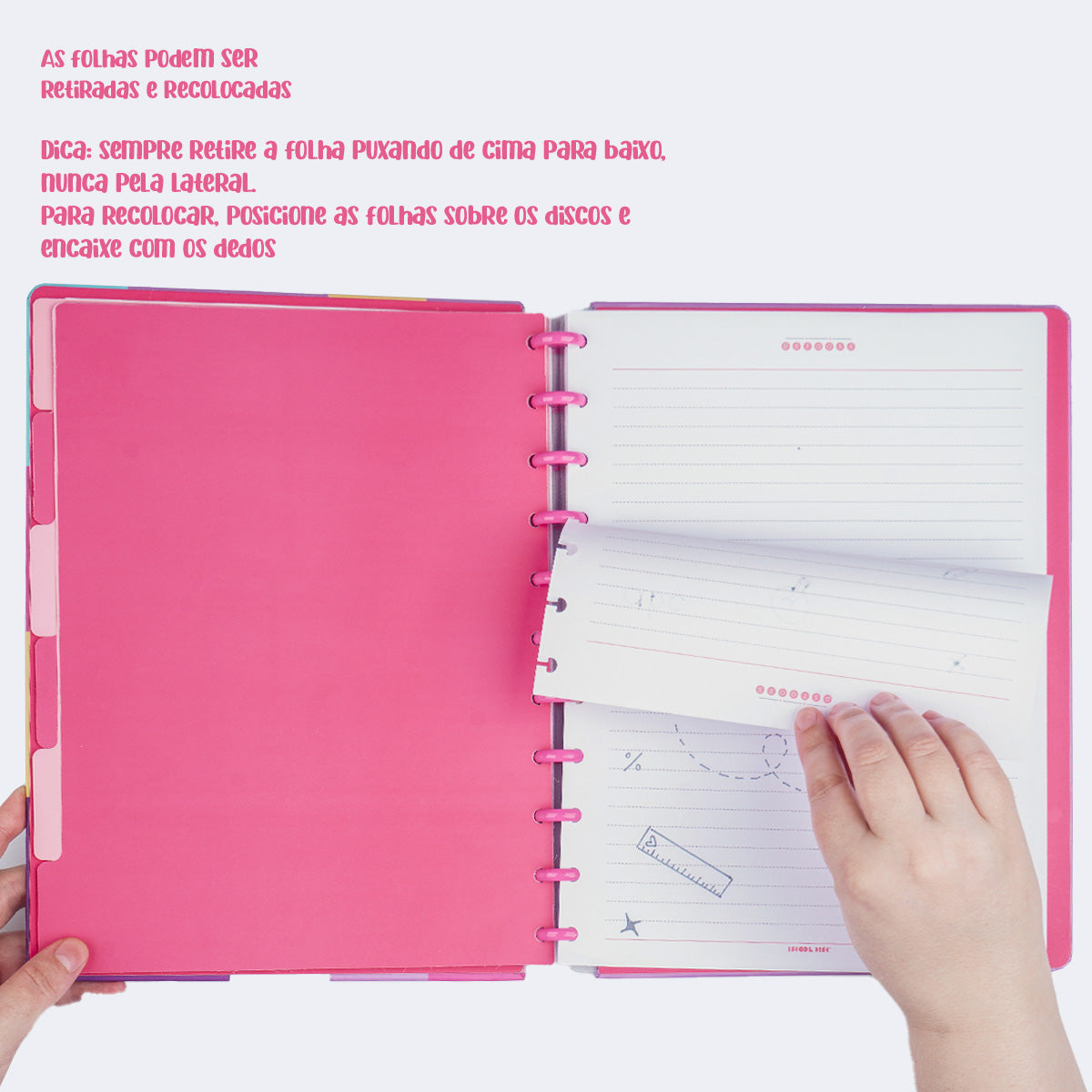 As folhas com papel encorpado de 90g são perfeitas para impressão de conteúdos, escrever e desenhar com conforto, enquanto o sistema 100% modular do caderno inteligente permite retirar e recolocar as folhas sempre que quiser, personalizando do jeitinho que a menina ama.