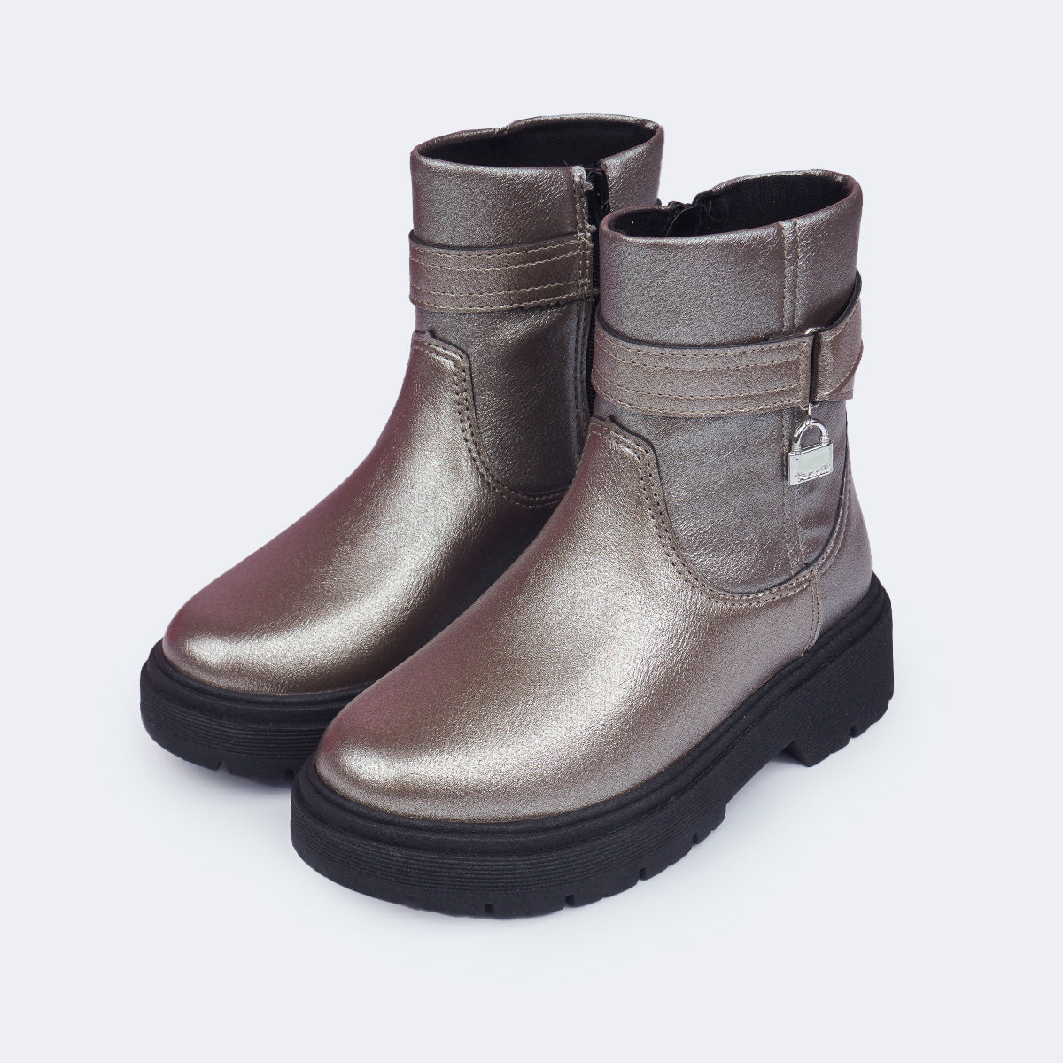 Com visual marcante, esta bota coturno infantil grafite foi criada para meninas que gostam de looks modernos sem abrir mão do conforto. O acabamento liso com aspecto de couro e o pingente de cadeado valorizam o estilo urbano, perfeita para acompanhar meninas em diferentes ocasiões como festas, passeios e até na escola.