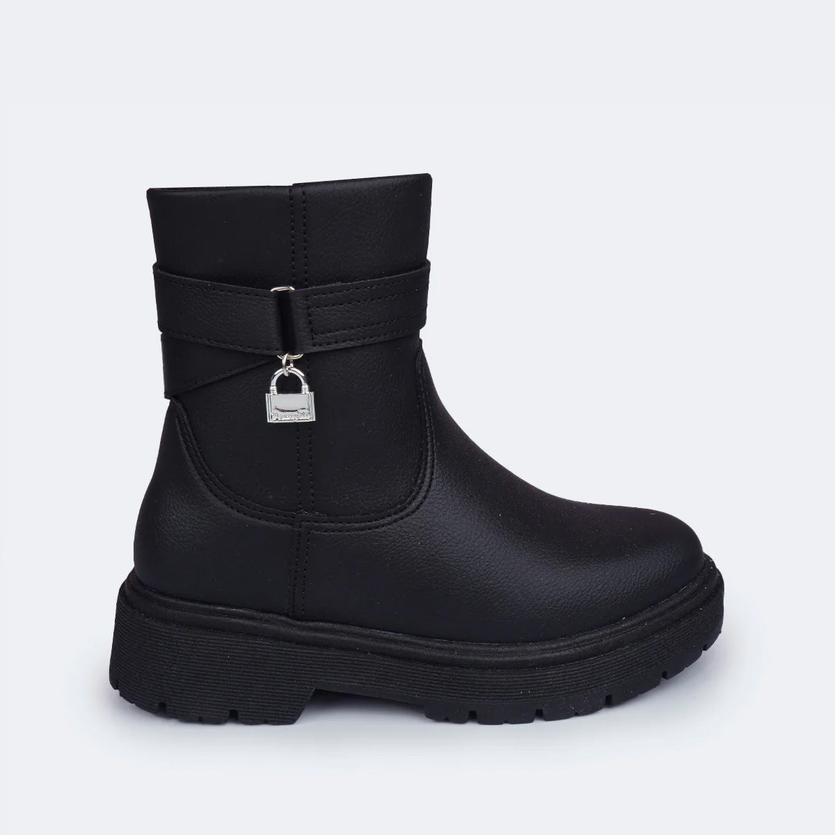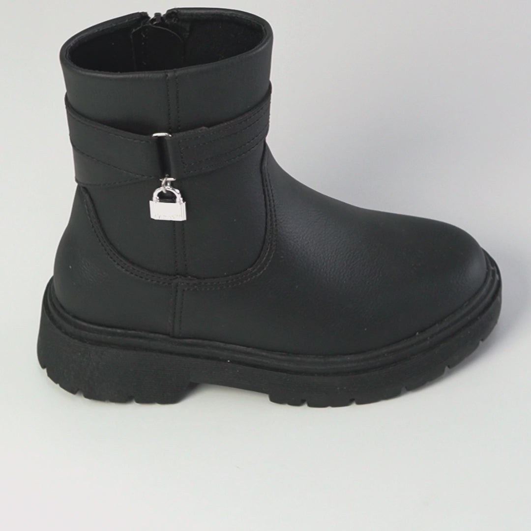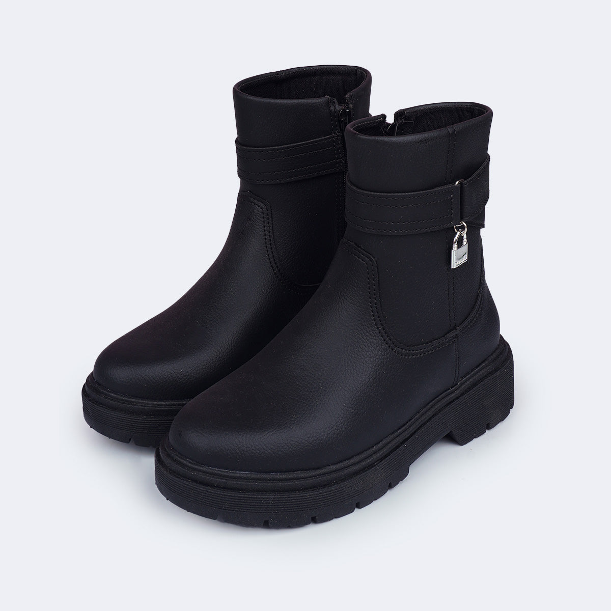 Com visual marcante, esta bota coturno infantil preta foi criada para meninas que gostam de looks modernos sem abrir mão do conforto. O acabamento liso com aspecto de couro e o pingente de cadeado valorizam o estilo urbano, perfeita para acompanhar meninas em diferentes ocasiões como festas, passeios e até na escola.