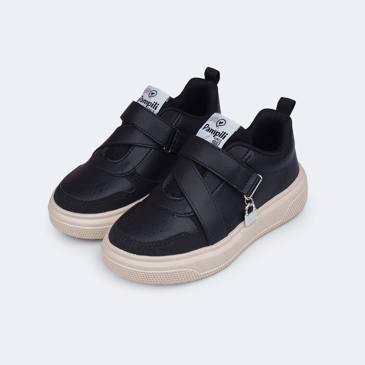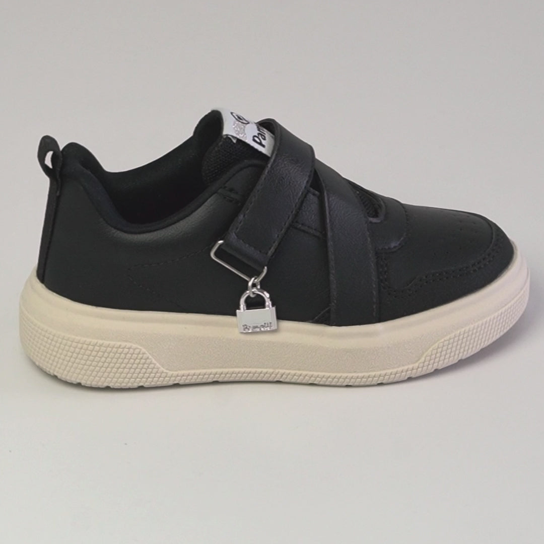 Tênis infantil preto que traduz a proposta da coleção Tal Filha, Tal Mãe, reforçando a conexão entre elas por meio de detalhes simbólicos. O cadeado aplicado no cabedal representa proteção, cuidado e cumplicidade, enquanto o design moderno acompanha o dia a dia da menina com estilo e praticidade.