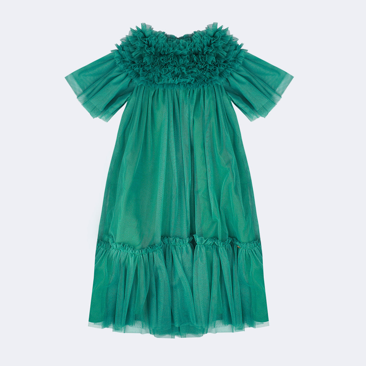 Delicado e cheio de movimento, este vestido em tule verde foi criado para tornar ocasiões especiais ainda mais mágicas. Com camadas suaves de tule e franzidos que trazem textura e volume, a peça oferece um visual encantador para meninas.