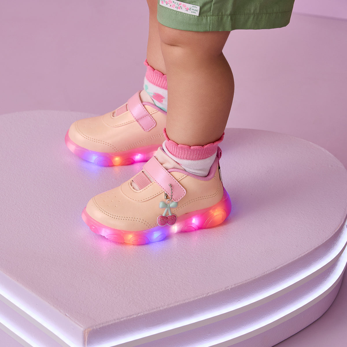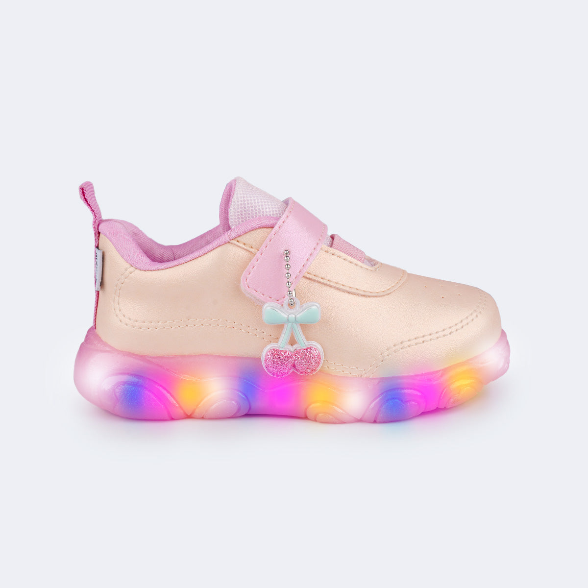 Cheio de delicadeza e diversão, esse tênis de led é perfeito para acompanhar as meninas em cada descoberta! Com design levemente perolado em tons de pêssego e rosa, o modelo traz um solado antiderrapante translúcido com luzes de LED coloridas que se acendem a cada passo e um charmoso pingente de cerejinha com glitter, deixando o visual ainda mais encantador.