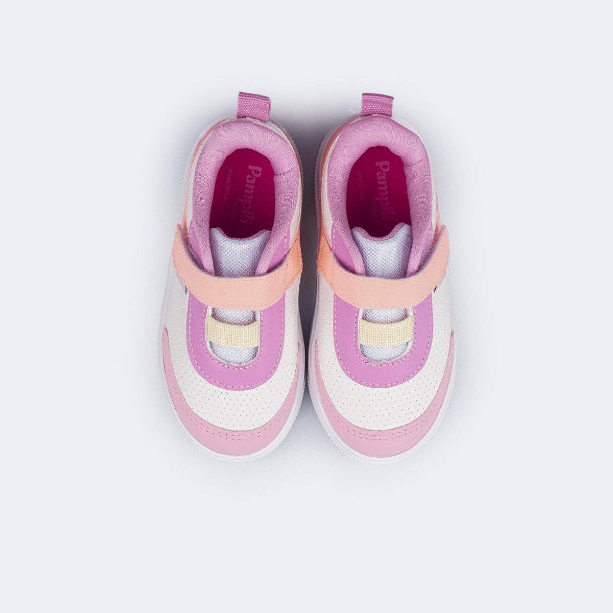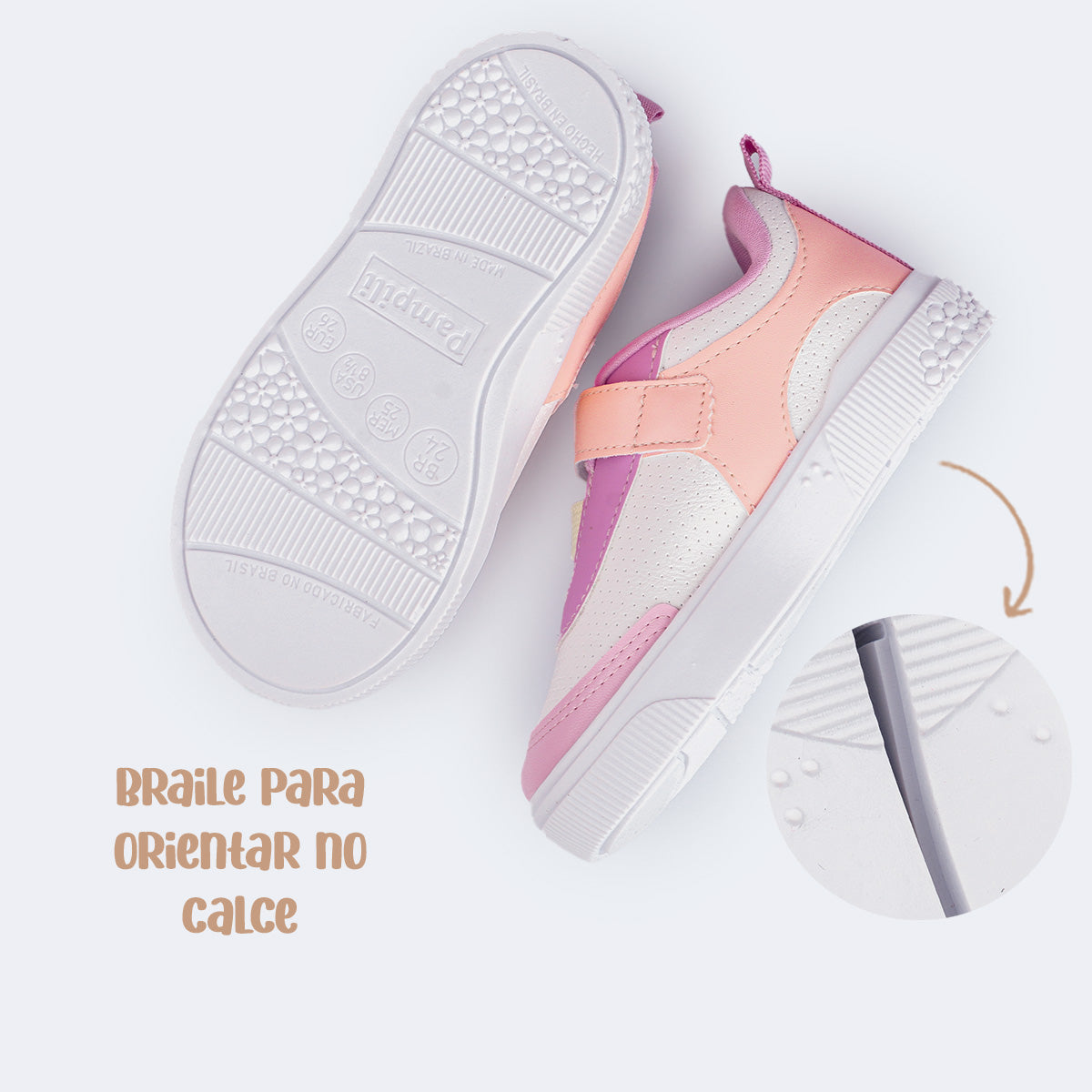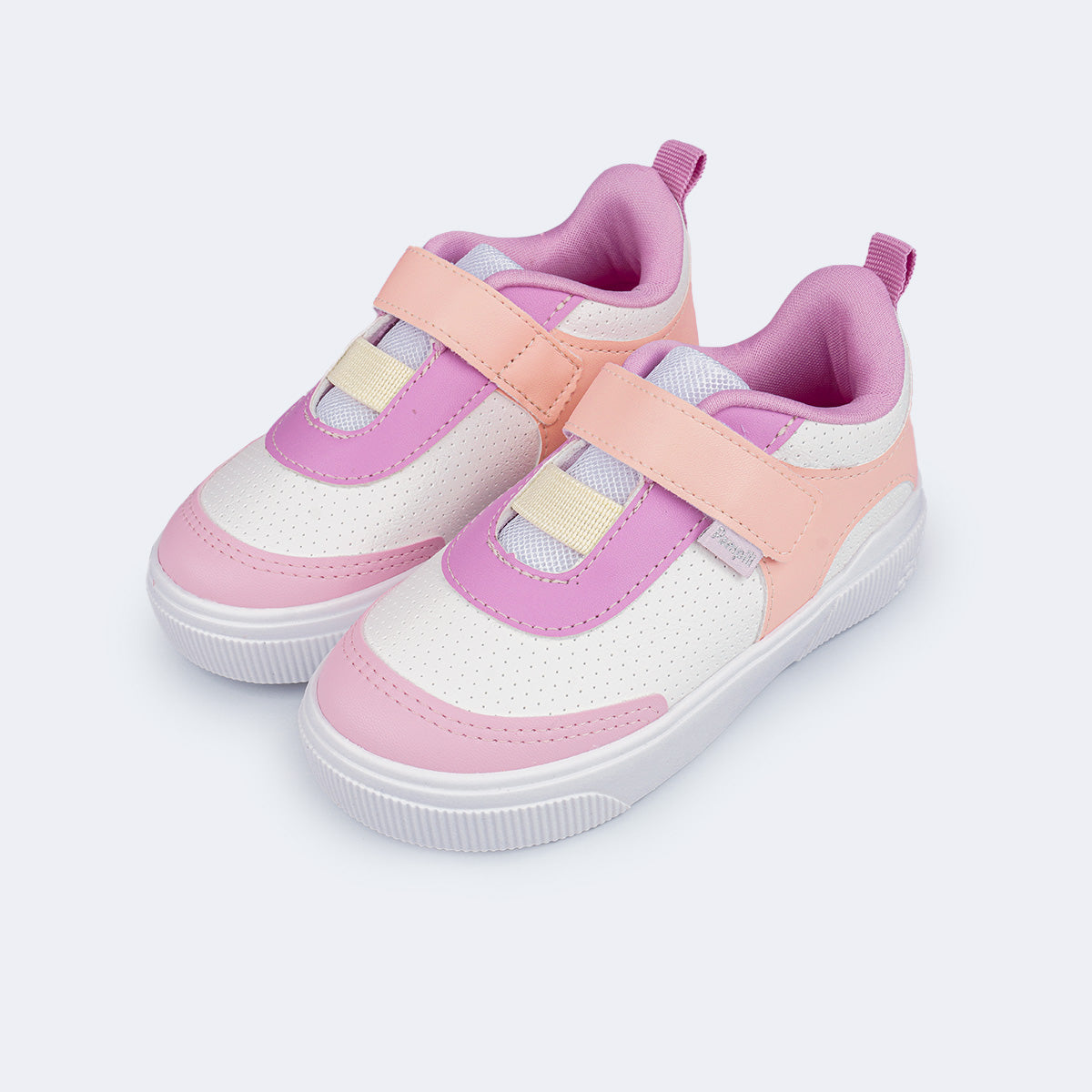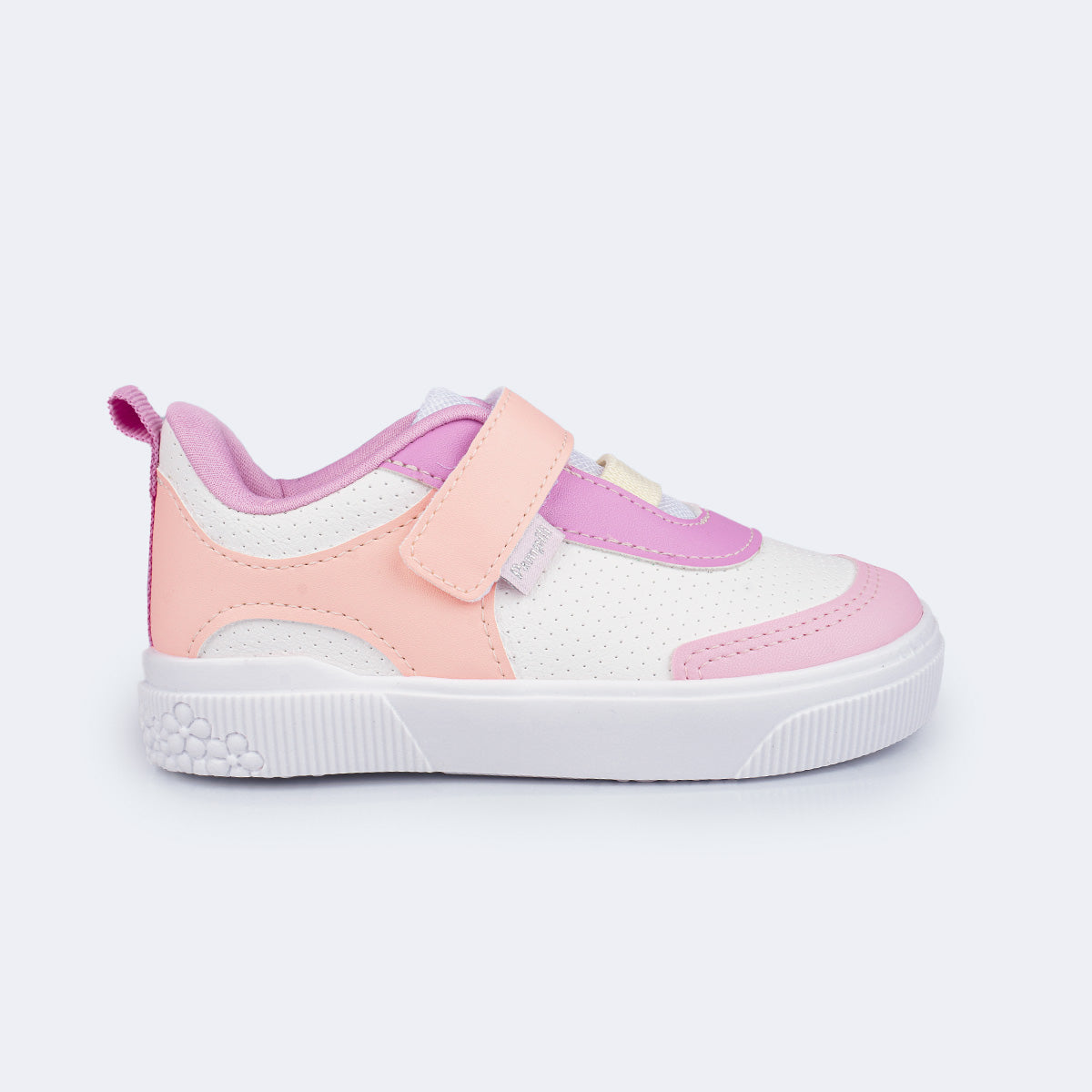 Pensado para acompanhar a rotina das meninas, este tênis infantil branco com recortes coloridos une praticidade, resistência e o visual delicado que combina com tudo.