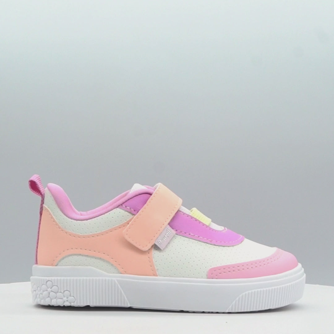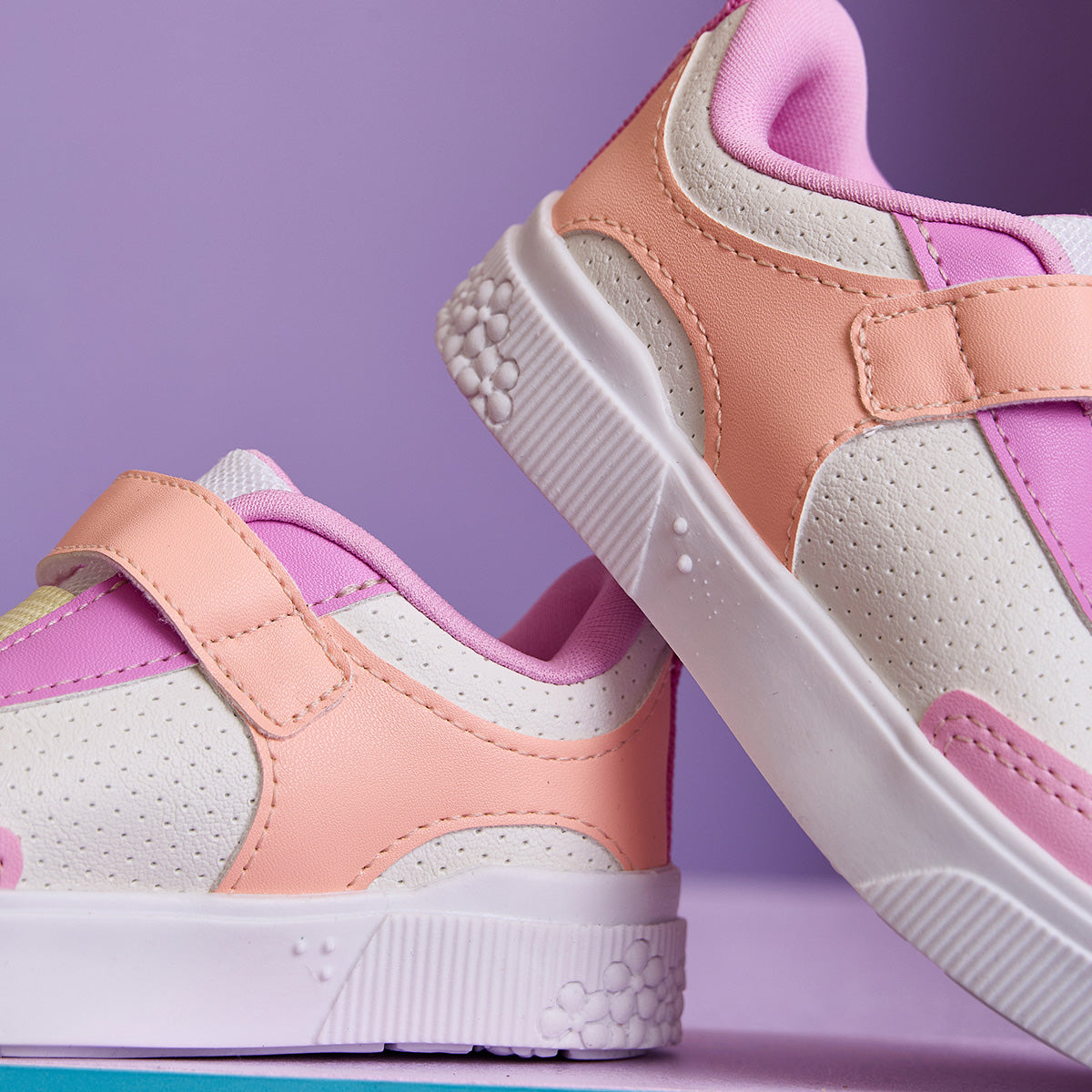 O cabedal em material resistente, com perfuros que favorecem a respirabilidade, garante fácil limpeza e excelente durabilidade no dia a dia. O fechamento em fita aderente torna o calce rápido e simples, incentivando a independência das meninas e facilitando a rotina das famílias.