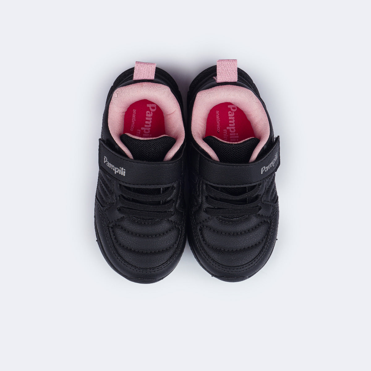 Pensado para acompanhar a rotina escolar das meninas, este tênis infantil preto é leve, flexível e muito confortável — perfeito para os dias cheios de atividades. A combinação do cabedal resistente com detalhes em rosa claro cria um visual discreto e funcional, ideal para o dia-a-dia.
