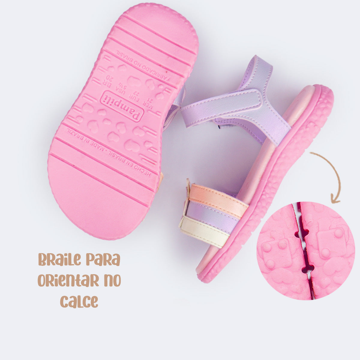 Essa sandália conta com estrutura super leve e flexível, respeitando o caminhar natural dos pezinhos. Os fechos de contato duplos facilitam o calce e permitem ajuste personalizado. A palmilha anatômica oferece maciez e bem-estar prolongado, enquanto o solado antiderrapante é estável e doa maior segurança ao caminhar. O solado com identificação em braile nos pés reforça o cuidado com inclusão e acessibilidade desde cedo.