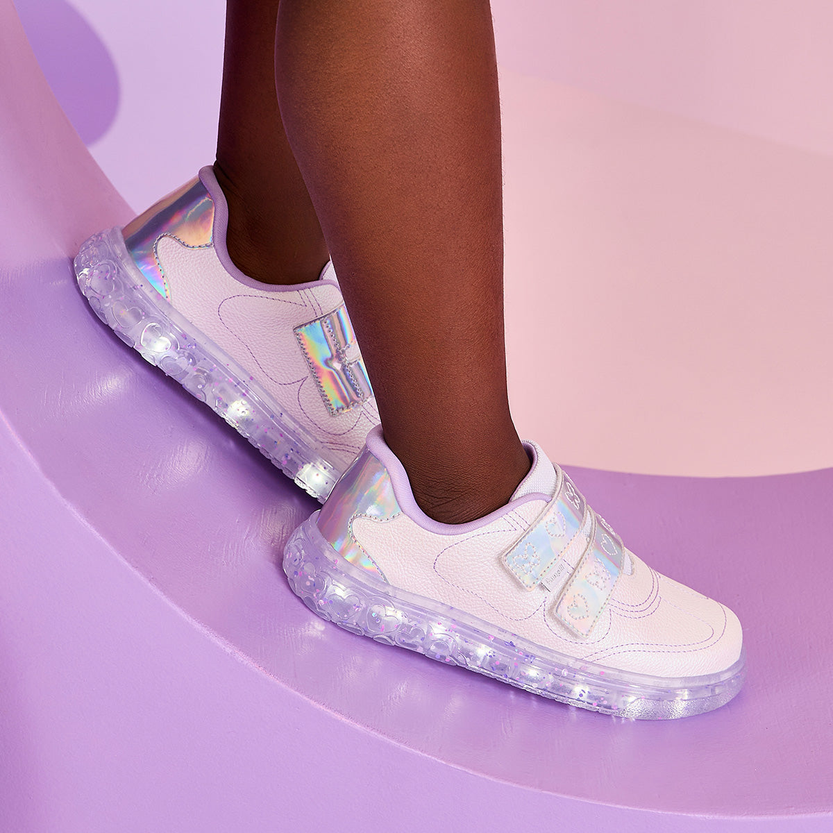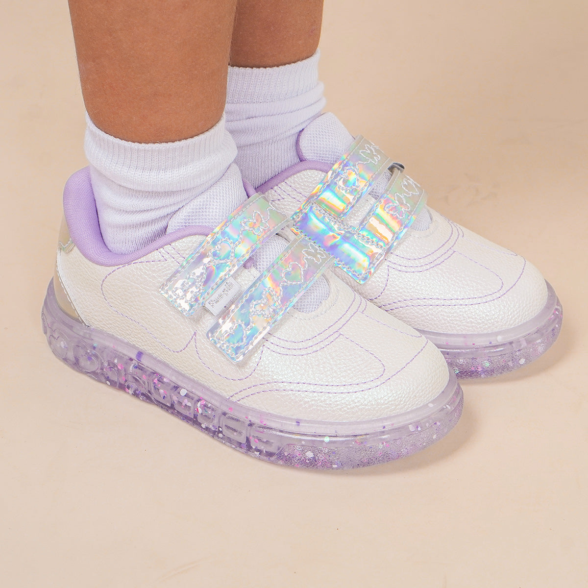 Cheio de charme e tecnologia, este tênis infantil com luzes de LED brancas é pura diversão para as meninas. Em tom branco perolado texturizado, com costuras na cor lilás, detalhes holográficos e solado translúcido com glitter, criam um visual delicado e moderno, perfeito para o dia a dia das meninas.