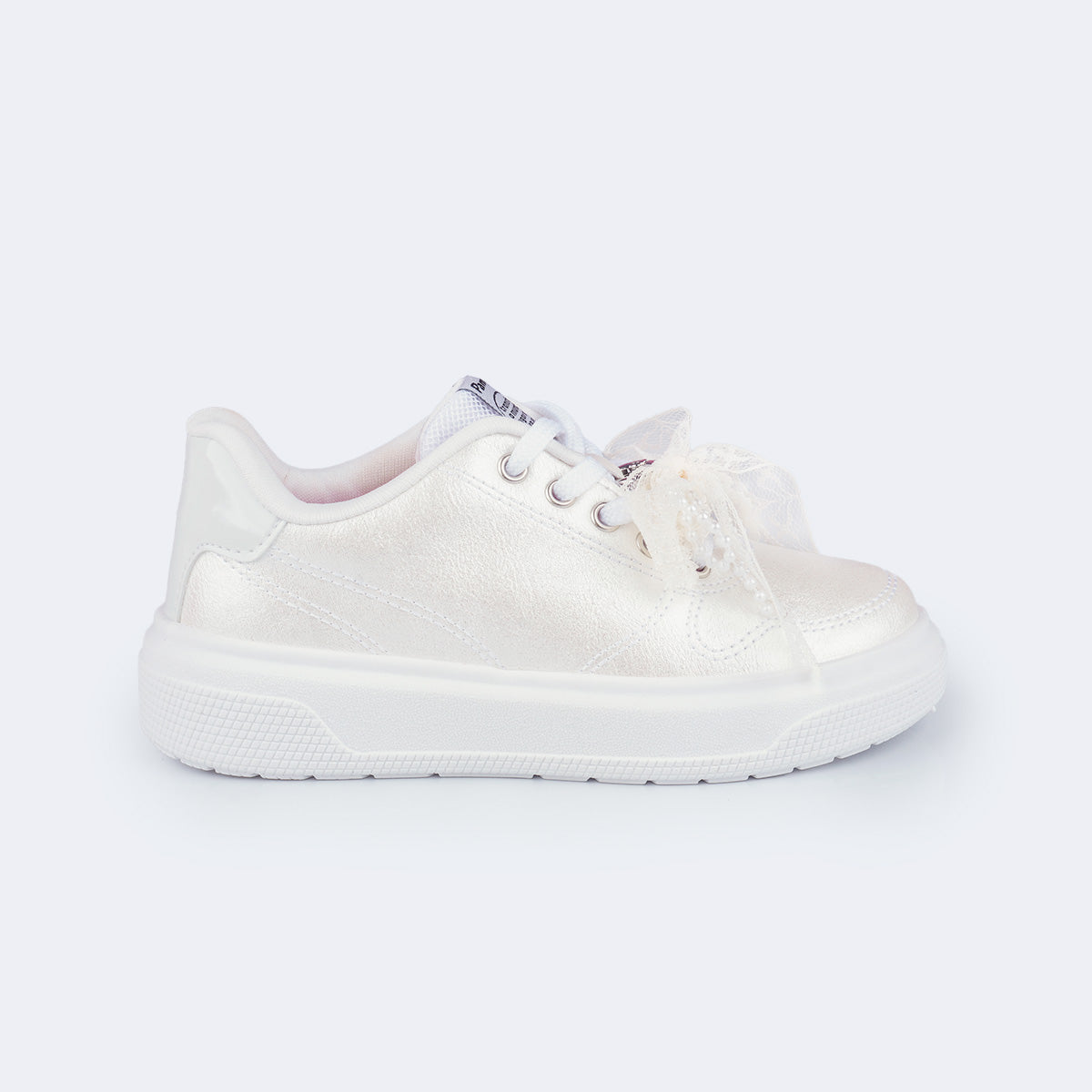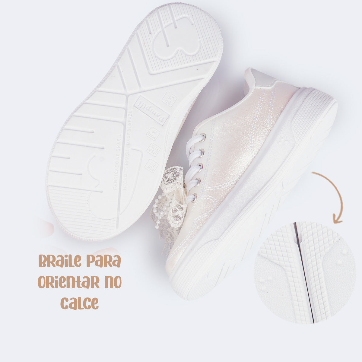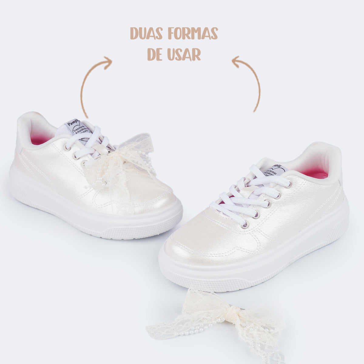 Delicado e moderno, este tênis infantil branco perolado com laço é o equilíbrio perfeito entre conforto e estilo! O brilho metalizado suave dá um toque atual ao visual, enquanto o pingente com laço de renda e pérolas (removível) permite diferentes formas de uso — ideal para meninas que amam personalizar o look com charme.