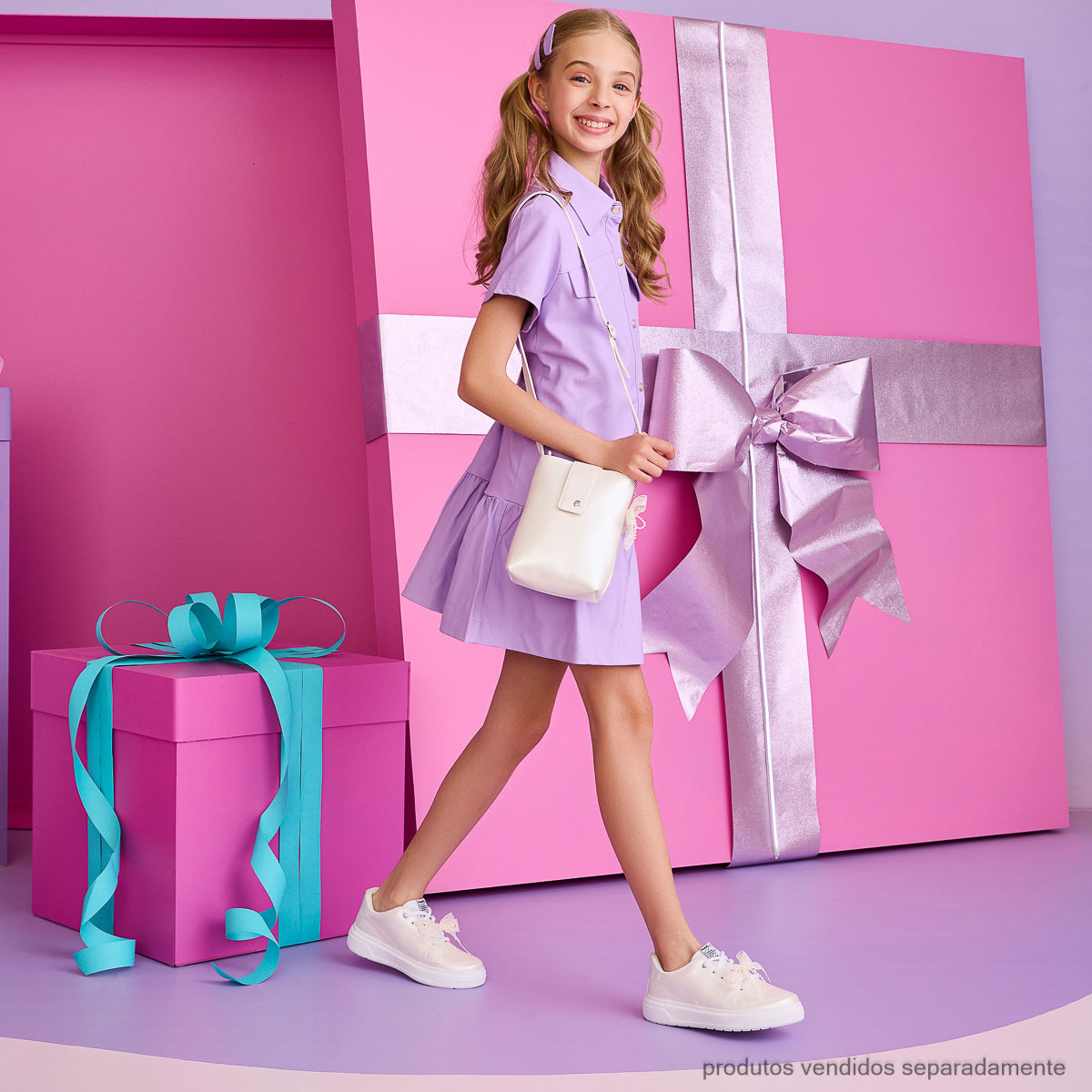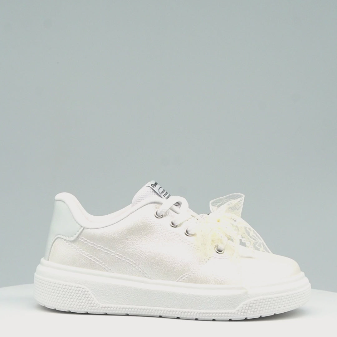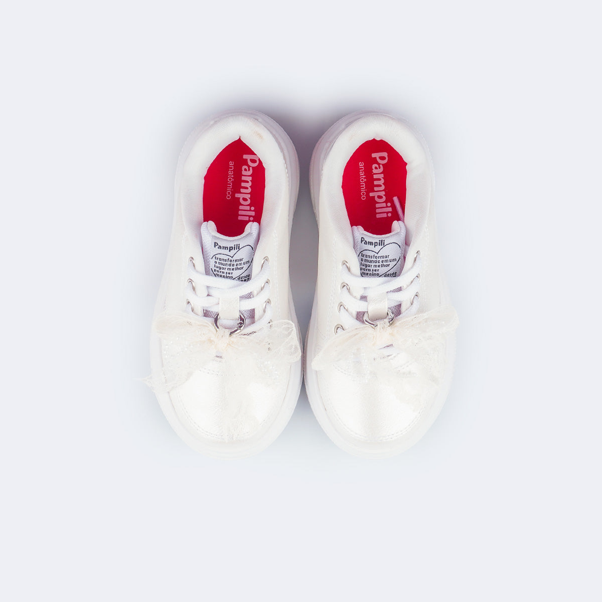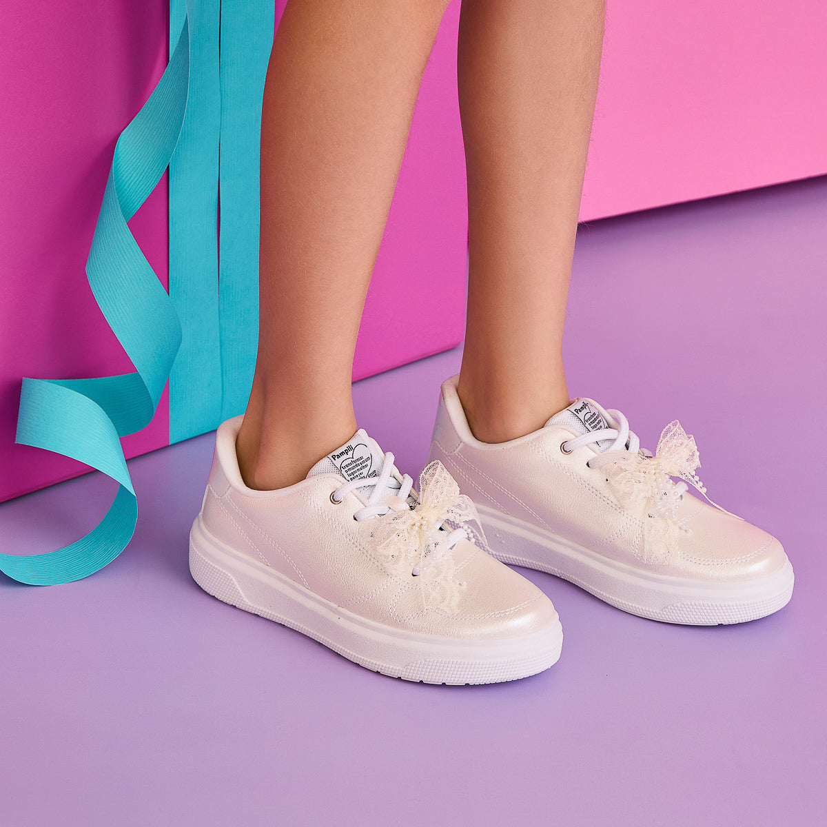 Delicado e moderno, este tênis infantil branco perolado com laço é o equilíbrio perfeito entre conforto e estilo! O brilho metalizado suave dá um toque atual ao visual, enquanto o pingente com laço de renda e pérolas (removível) permite diferentes formas de uso — ideal para meninas que amam personalizar o look com charme.