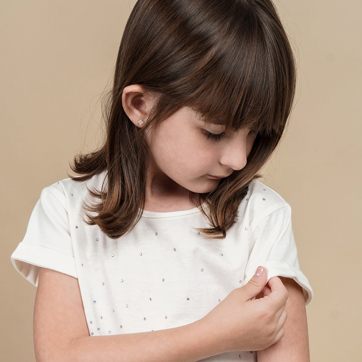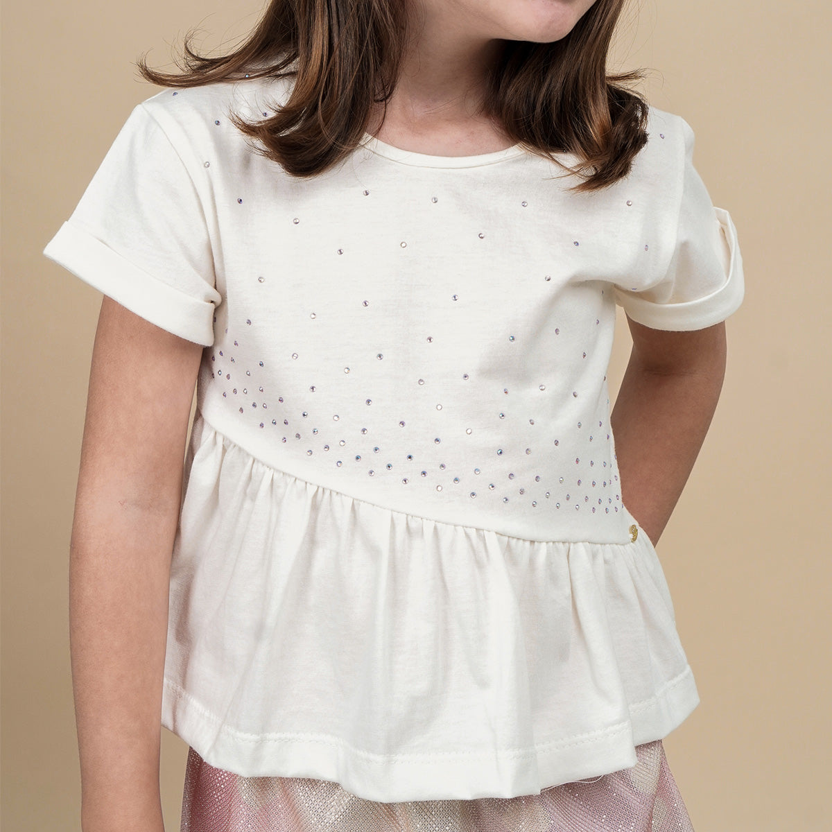 Blusa off white com manga curta feita em algodão suave, com toque agradável e respirável para os dias mais quentes. Os detalhes em strass furta-cor doam toque de brilho a peça e o babado assimétrico traz movimento e modernidade ao design.