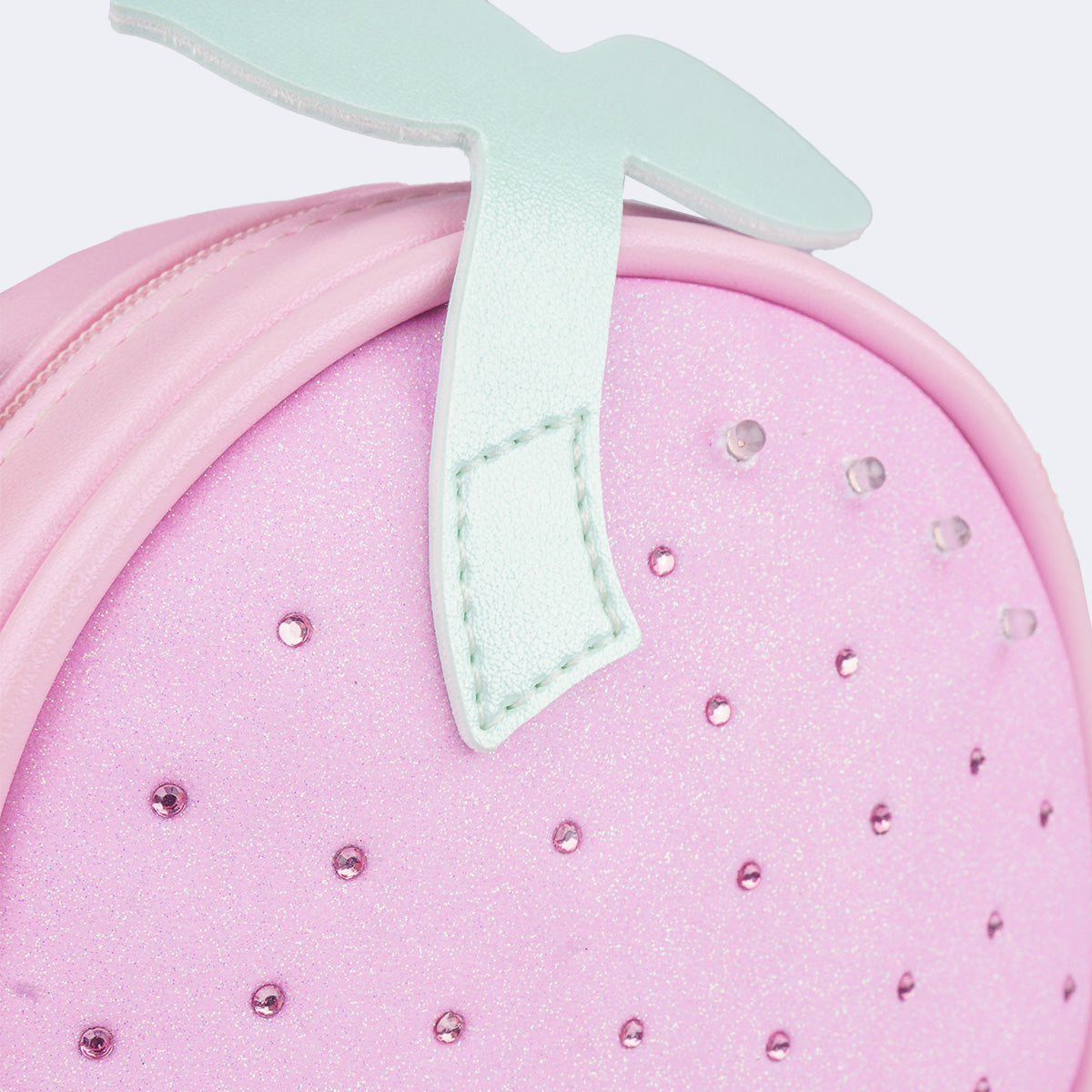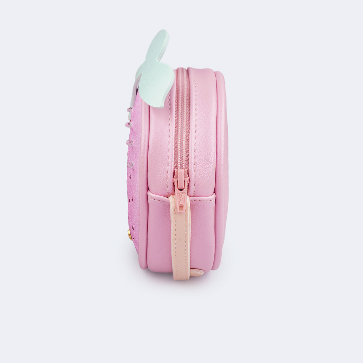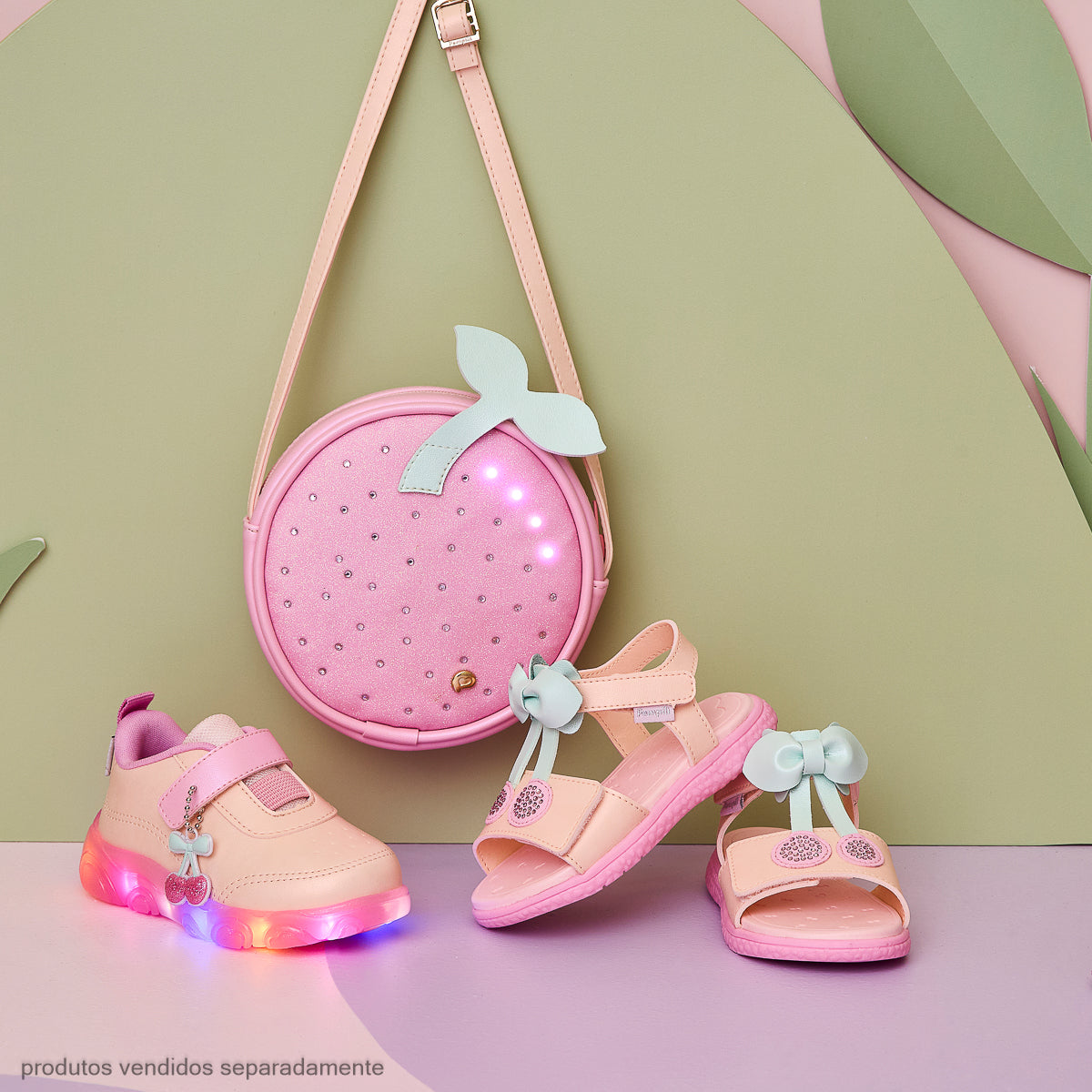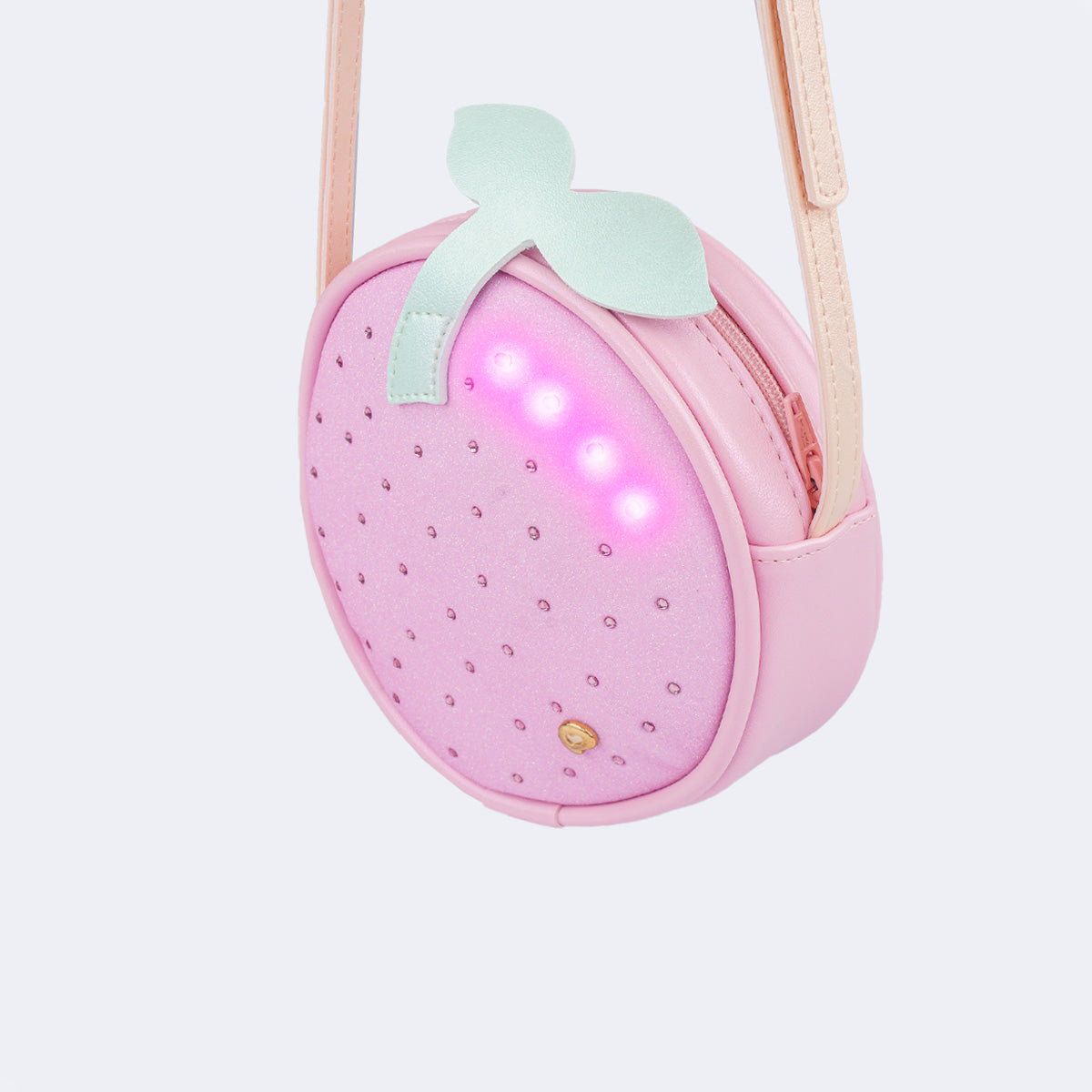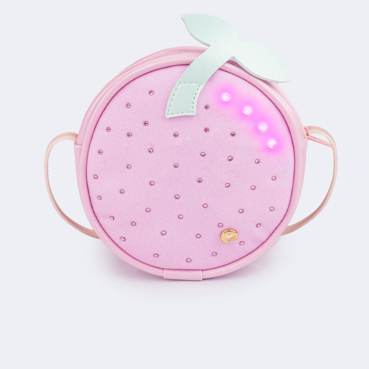 Cheia de ternura, esta bolsinha em formato de cereja é puro charme para acompanhar a menina em todos os momentos! Em tom de rosa claro, o modelo redondinho traz um brilho delicado com pedrinhas aplicadas com hotfix termocolante e luzes de LED rosa que acendem para deixar o visual ainda mais encantador.
