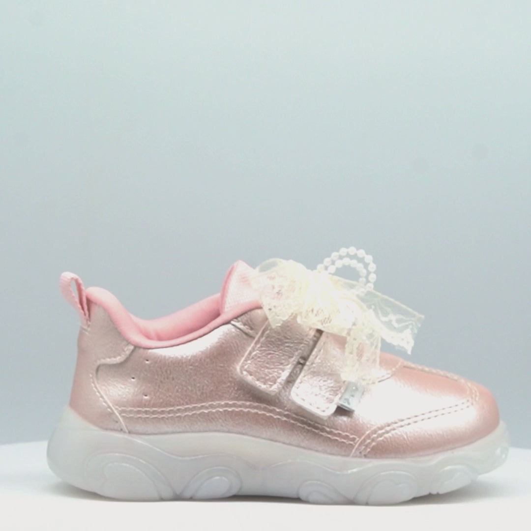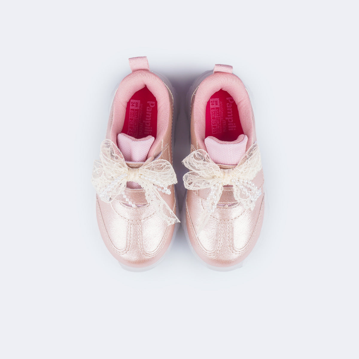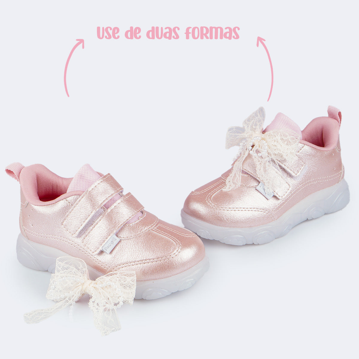 Pensado para acompanhar a rotina da menina com conforto e delicadeza, este tênis rosê perolado traz um cabedal estruturado, perfeito para os primeiros passinhos. O laço de renda com mini pérolas — que pode ser removível — permite personalizar o visual, deixando o modelo mais romântico ou mais neutro conforme a ocasião. O fechamento em dupla fita aderente garante calce fácil e autonomia para a menina, enquanto o forro macio e o colarinho comfy envolvem os pezinhos de forma acolhedora durante todo o dia.