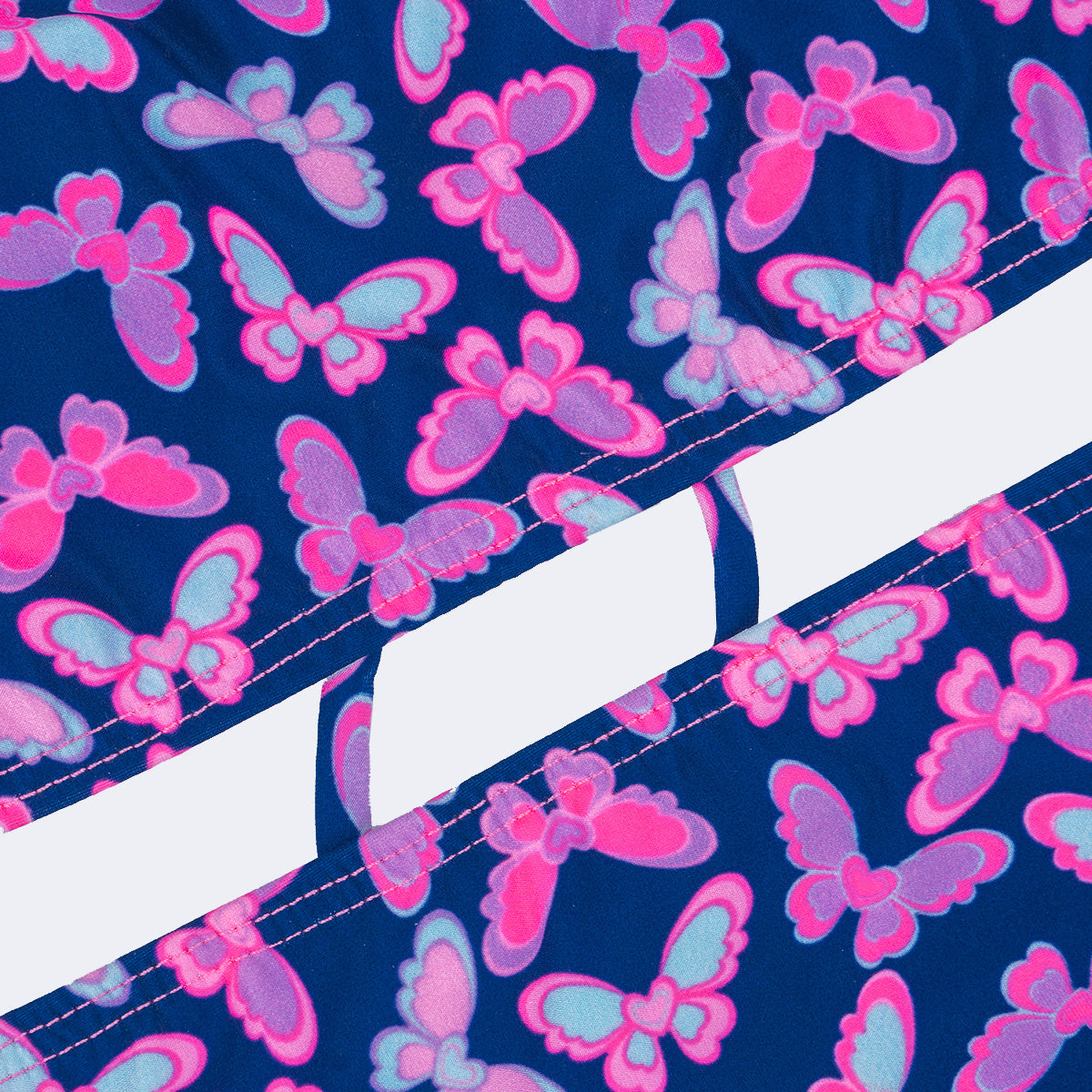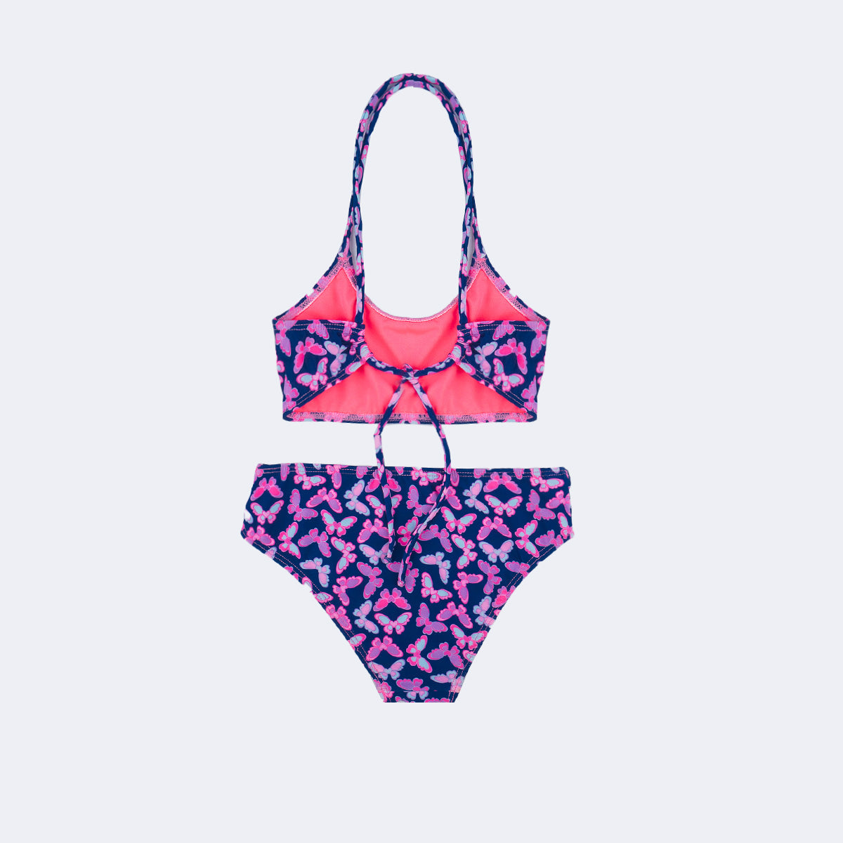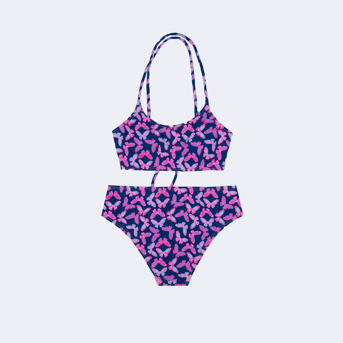 Conjunto biquíni infantil azul marinho com top modelo frente única com amarração, permitindo regulagem e ajuste personalizado. A estampa com borboletas em tons de azul, rosa e lilás deixam o visual alegre e colorido, enquanto a calcinha segue o mesmo padrão, completando o look de verão.