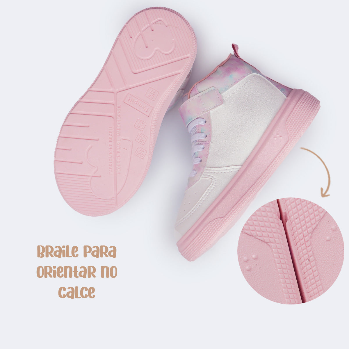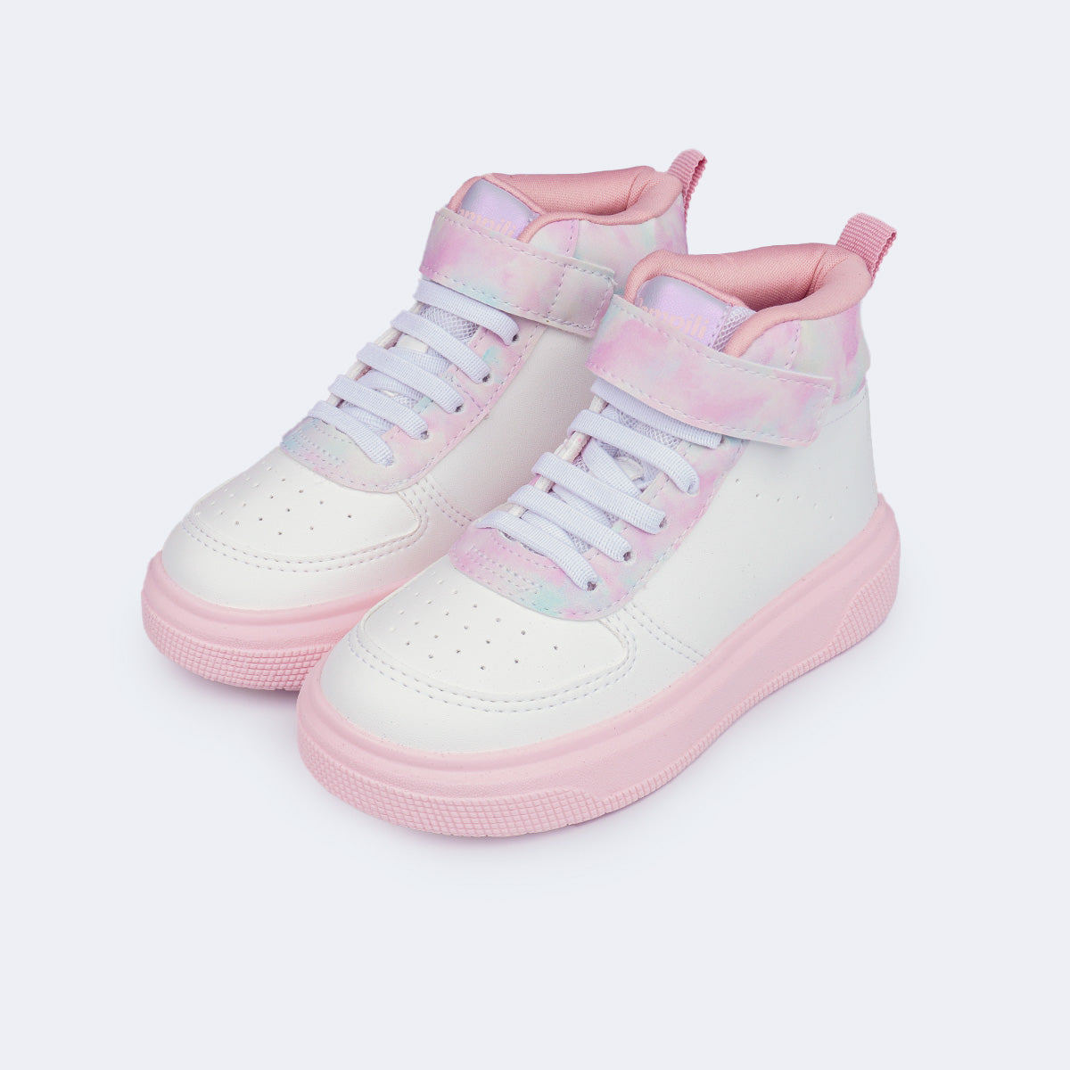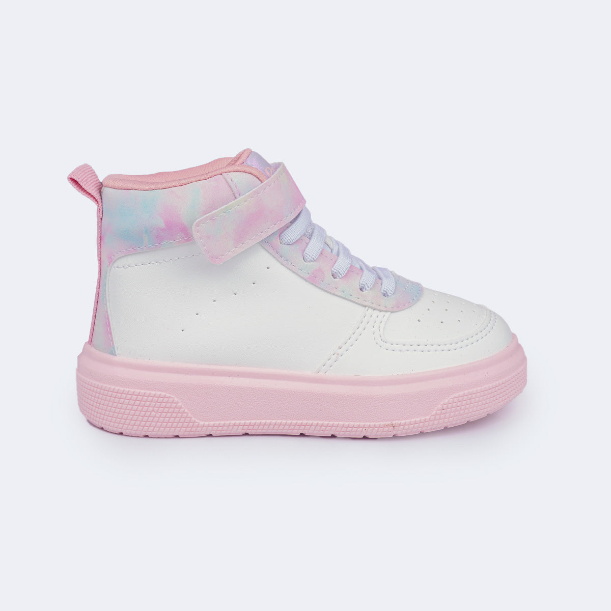 O tênis infantil branco de cano médio traz um visual moderno com recortes tie dye, que adiciona estilo e delicadeza ao look. Calce fácil, confeccionado em material resistente e fácil de limpar, é perfeito para acompanhar a rotina com praticidade.