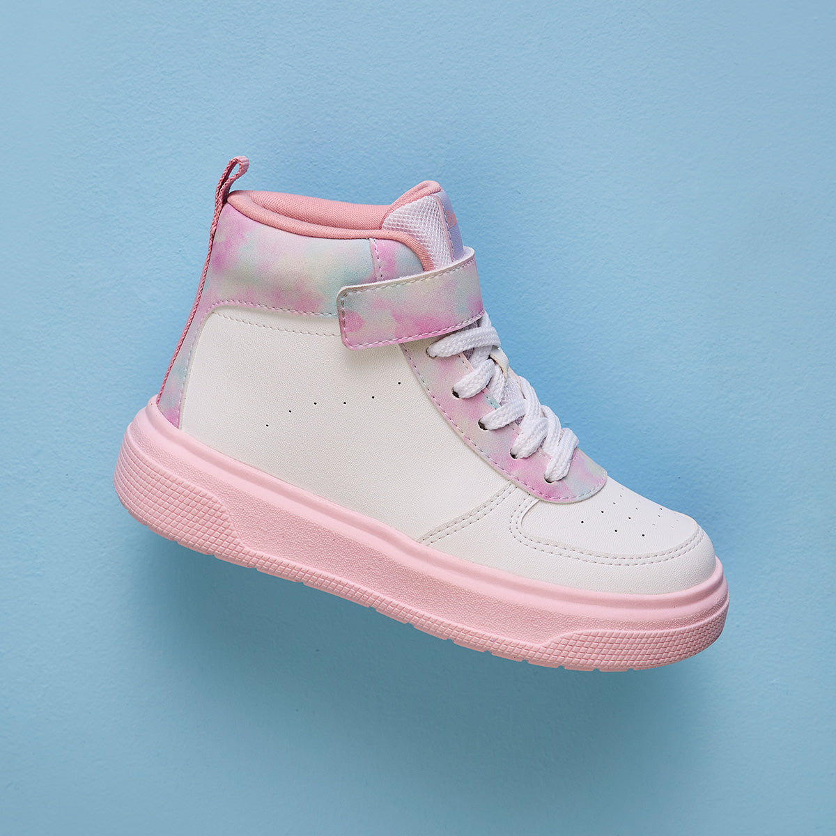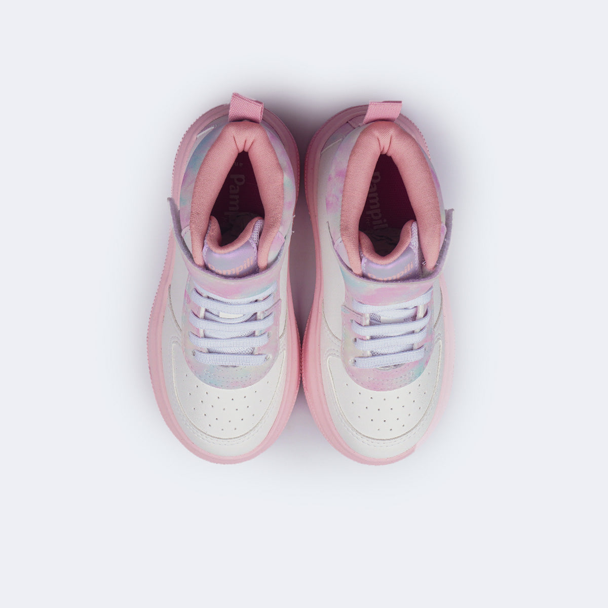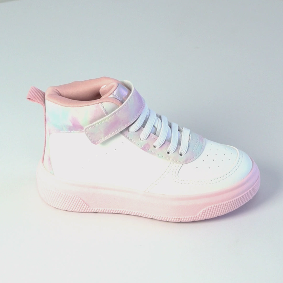 O tênis infantil branco de cano médio traz um visual moderno com recortes tie dye, que adiciona estilo e delicadeza ao look. Calce fácil, confeccionado em material resistente e fácil de limpar, é perfeito para acompanhar a rotina com praticidade.