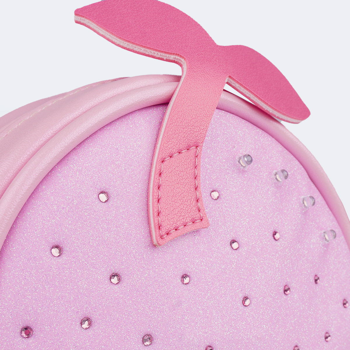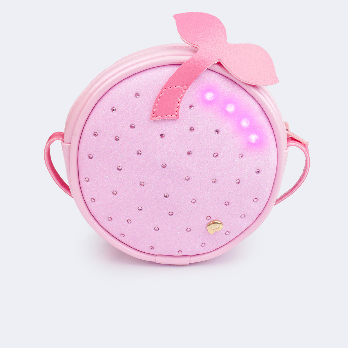 Cheia de ternura, esta bolsinha em formato de cereja é puro charme para acompanhar a menina em todos os momentos! Em tom de rosa claro, o modelo redondinho traz um brilho delicado com pedrinhas aplicadas com hotfix termocolante e luzes de LED rosa que acendem para deixar o visual ainda mais encantador.