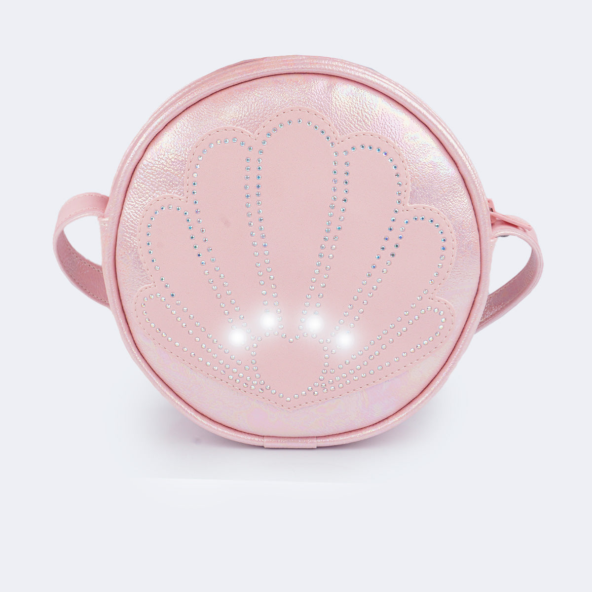 Inspirada no fundo do mar, esta bolsa redonda cor rosa perolado é o acessório perfeito para acompanhar as meninas em todos os momentos. Com luzes de LED e aplicação em formato de concha, o modelo traz detalhes que iluminam o visual, despertando a imaginação das pequenas.