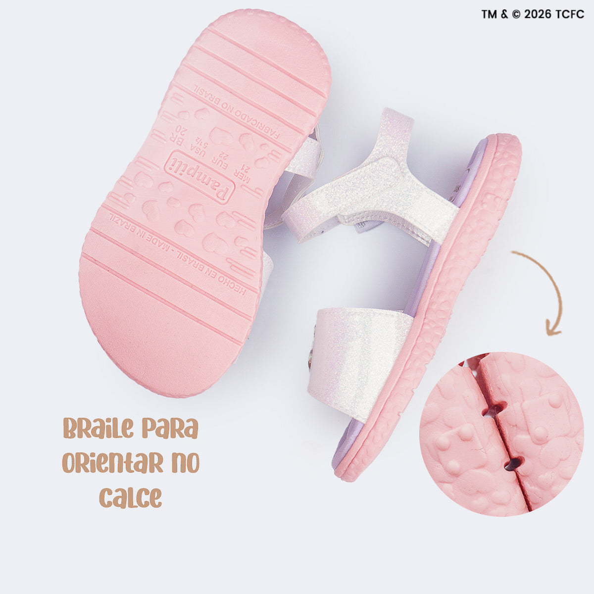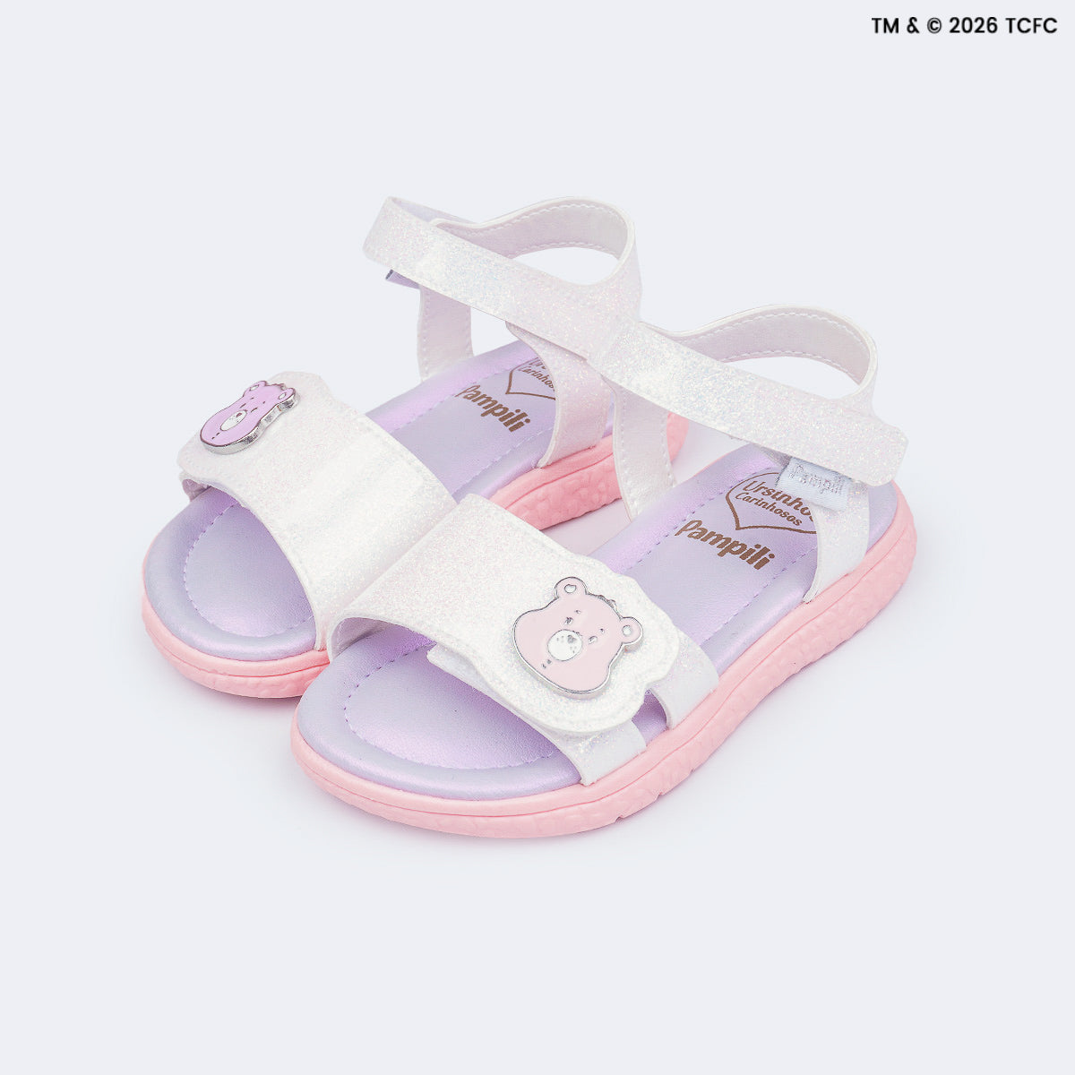 Delicada e cheia de brilho, essa sandália branca da coleção Ursinhos Carinhosos encanta com acabamento em glitter furta-cor e patch em metal esmaltado com as carinhas das ursinhas Animadinha e Carinhosa. O fechamento duplo em fita aderente permite ajuste personalizado e facilita o calce no dia a dia, enquanto a palmilha anatômica acolchoada garante conforto extra para os pezinhos. O solado leve, flexível e antiderrapante proporciona estabilidade e liberdade para acompanhar as meninas desde os primeiros passinhos com cuidado e delicadeza.