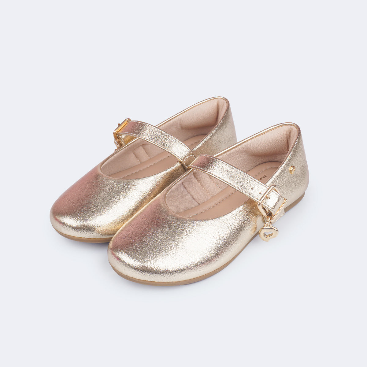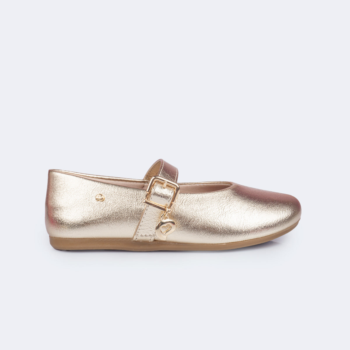 Sapatilha infantil dourada, perfeita para meninas que buscam um calçado moderno, confortável e cheio de estilo, equilibrando brilho metalizado com a versatilidade do dia a dia.