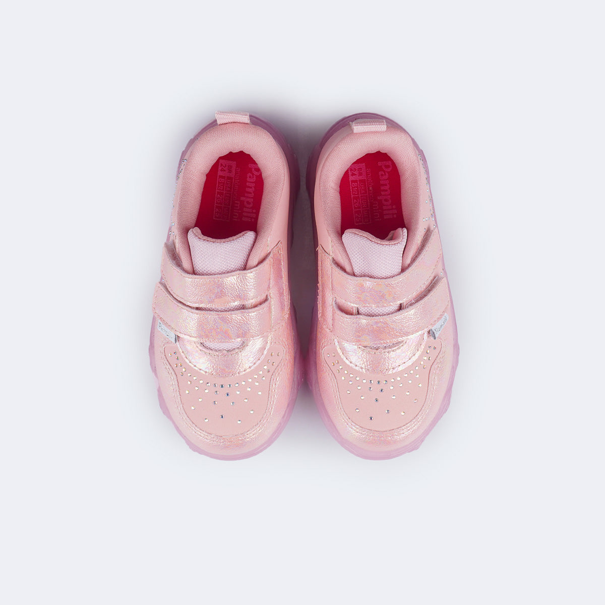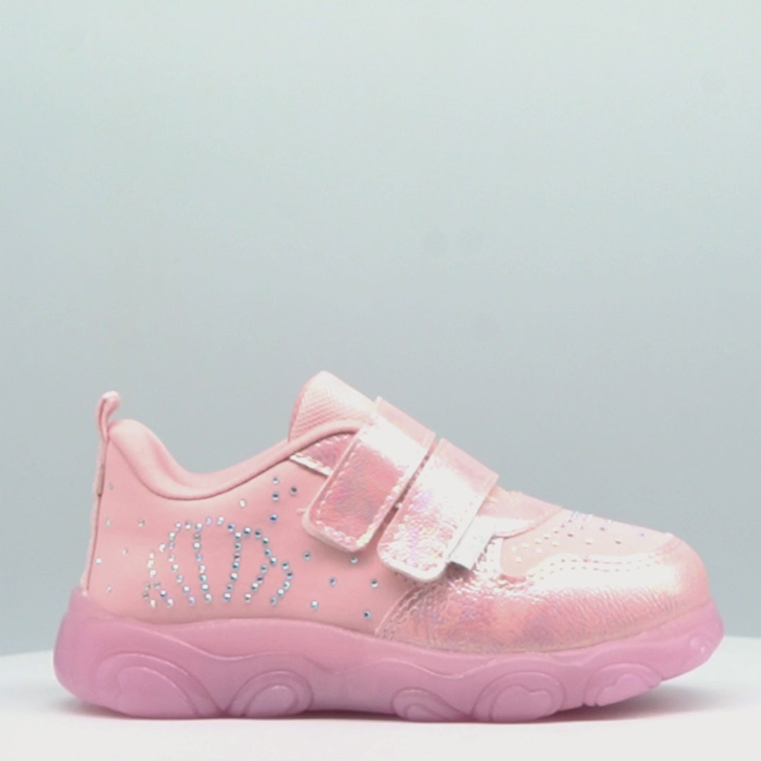 Um toque de magia a cada passo! O tênis de led rosa claro traz um design encantador com recortes de brilho suave holográfico e aplicação de strass formando uma concha, inspirando delicadeza e fantasia. O solado translúcido com luzes coloridas de LED deixa o visual ainda mais divertido, enquanto o fechamento duplo por fitas aderentes garante um calce fácil e autonomia para as meninas. Com forro macio absorvente, palmilha anatômica e solado antiderrapante, é perfeito para acompanhar os passinhos e brincadeiras com conforto e estilo.