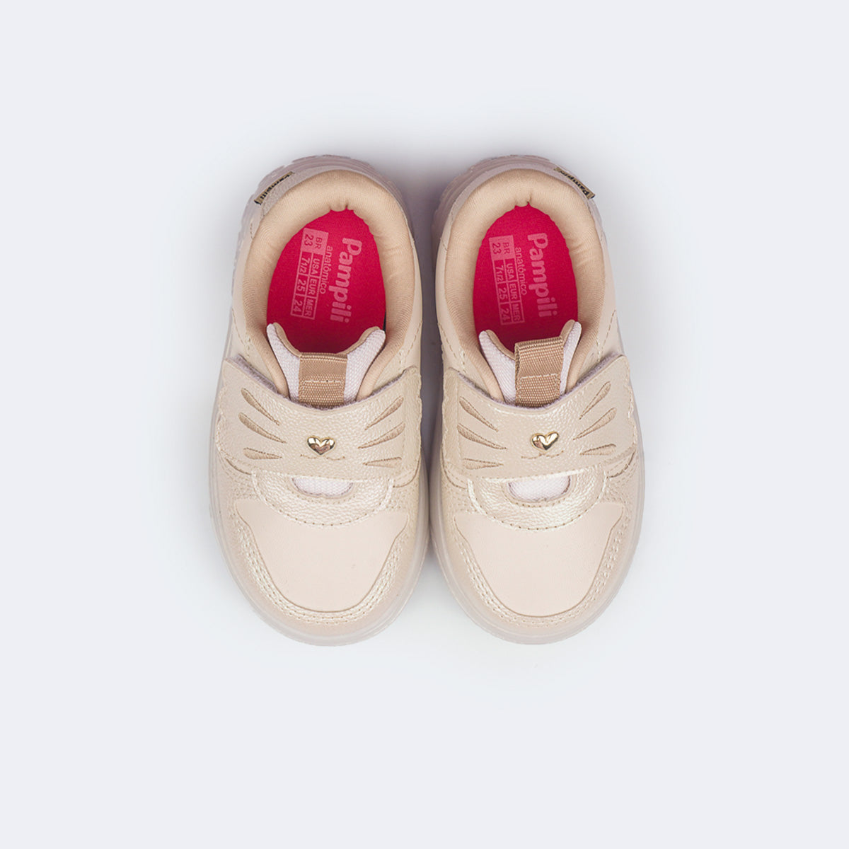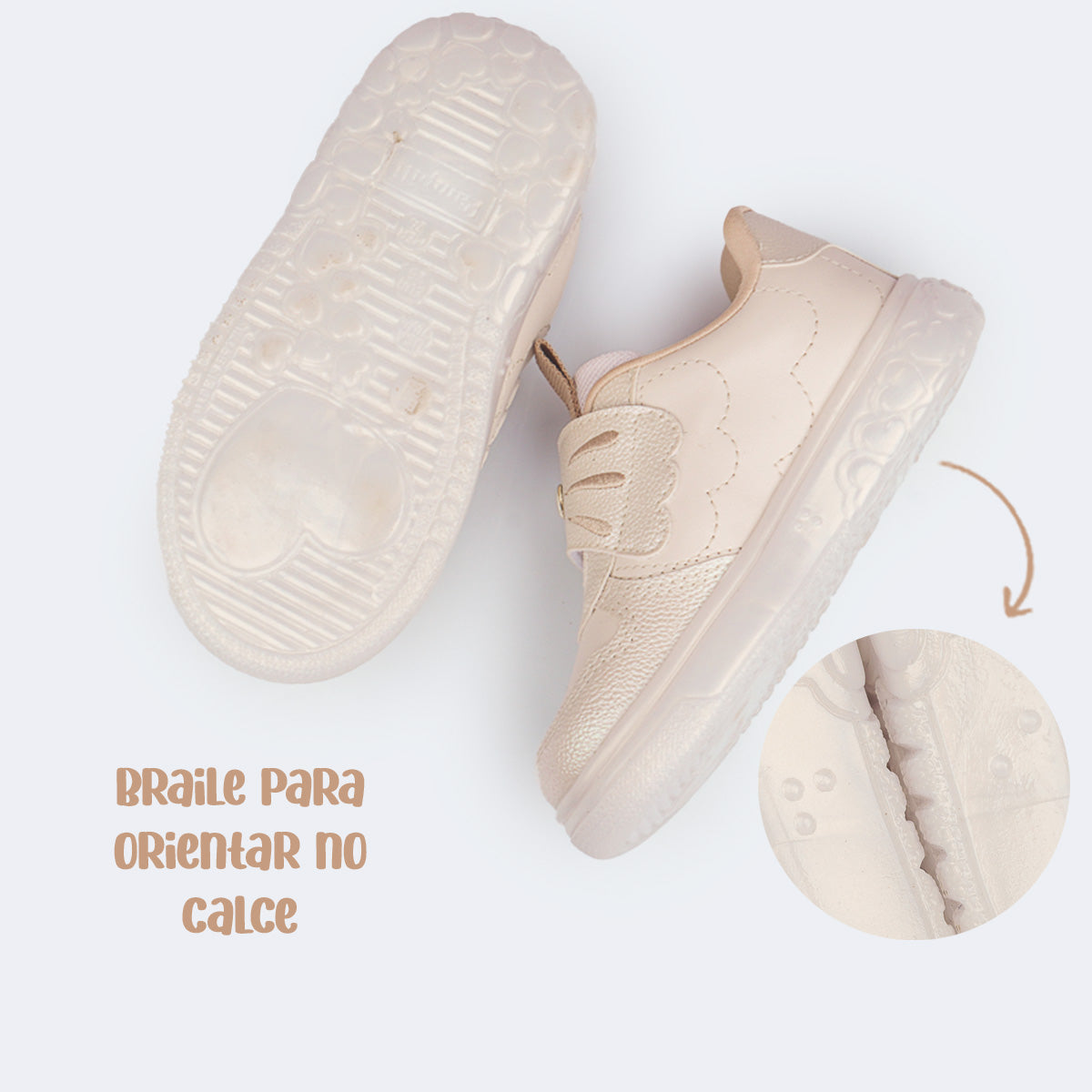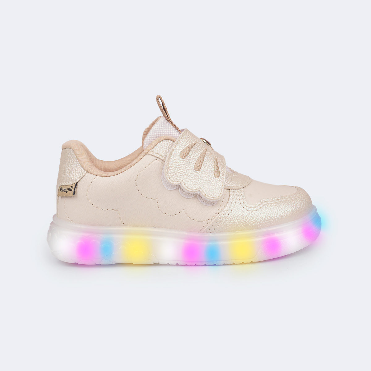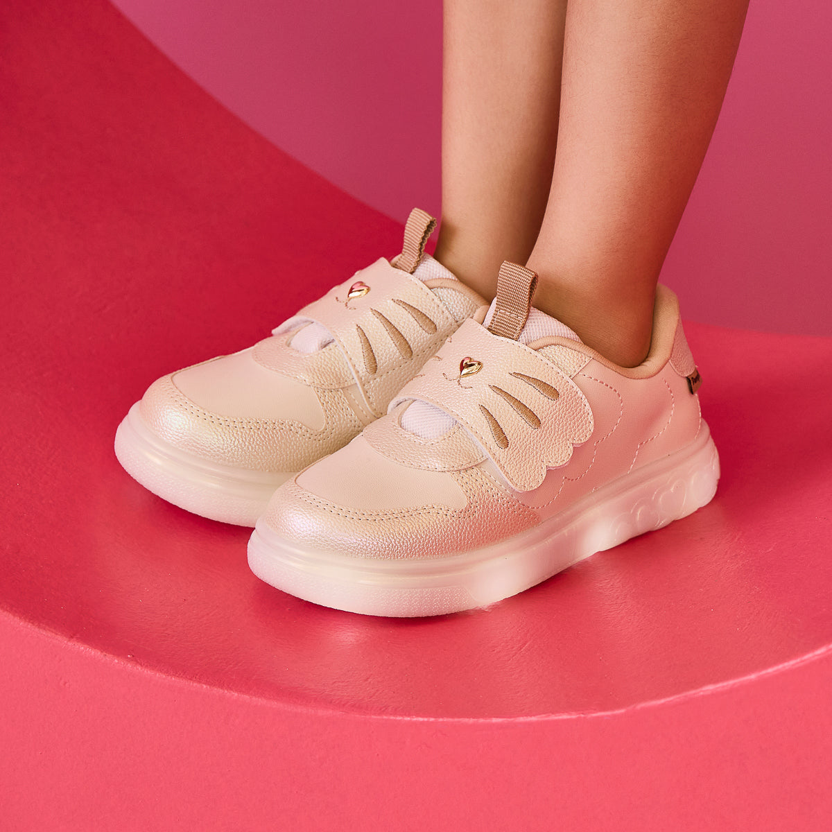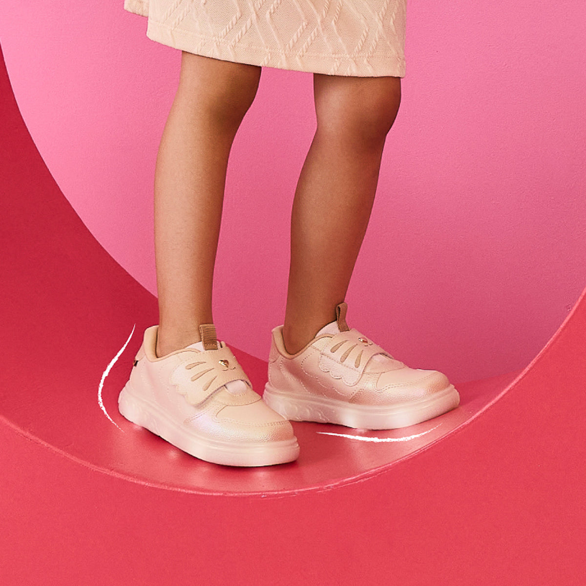 Tênis de led infantil nude é a escolha perfeita para as meninas brilharem com conforto e muita fofura. Com acabamento metalizado, o modelo traz bigodes de gatinho bordados no fechamento e um visual moderno que combina com a escola, passeios e festinhas. O calce fácil com fita aderente facilita a rotina e incentiva a autonomia, deixando tudo mais prático e estiloso.