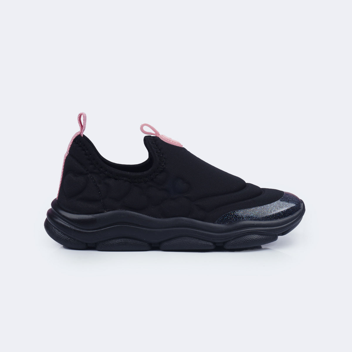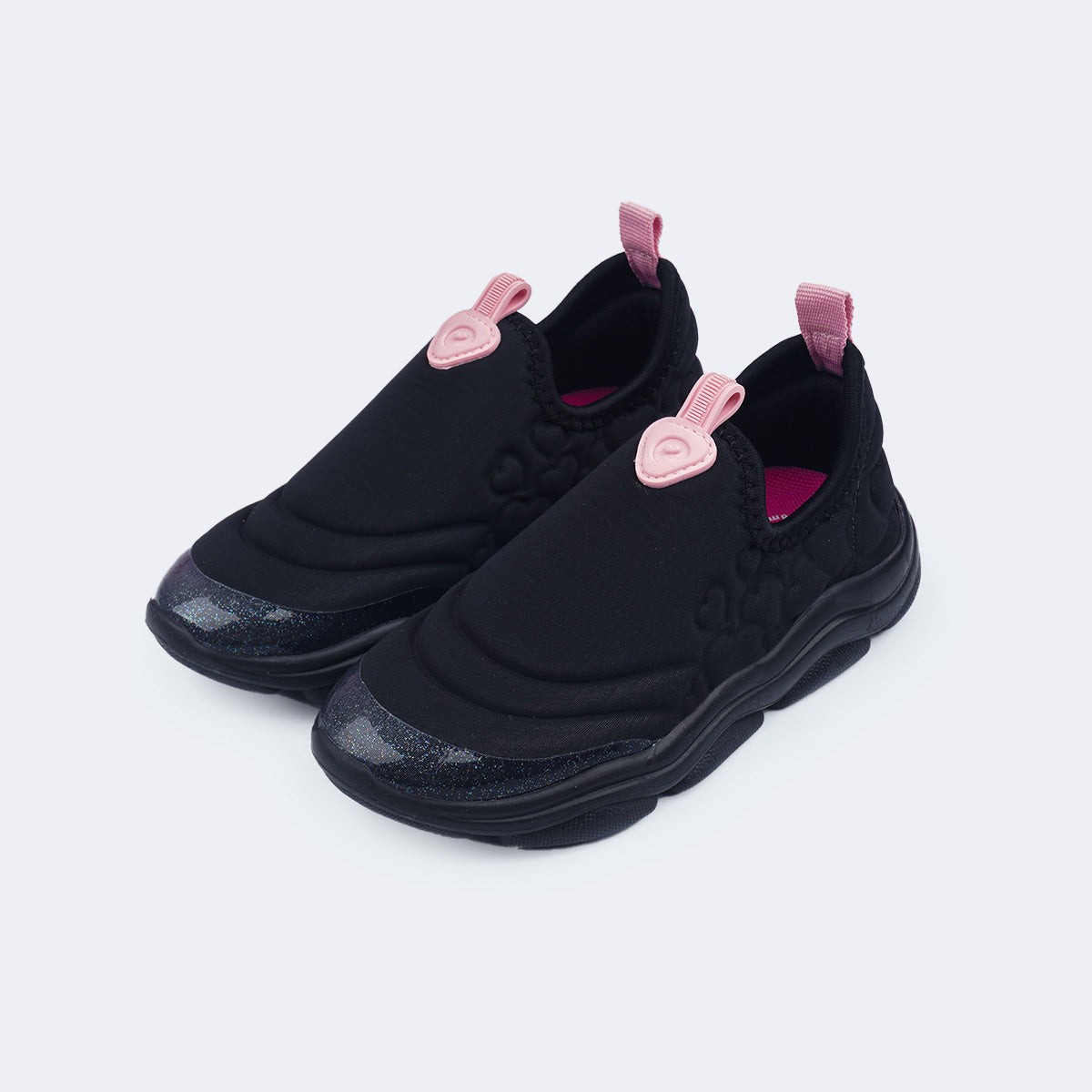 Tênis infantil calce fácil preto com corações em alto relevo, ideal para acompanhar a menina na rotina escolar e no dia a dia com praticidade e conforto, trazendo design maleável e abertura ampla que facilitam o calce e estimulam a autonomia. Desenvolvido em elastano resistente com ajusta aos pés com toque macio e auxilia na absorção do suor, enquanto o calcanhar acolchoado oferece apoio e bem-estar prolongado.