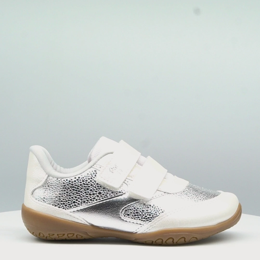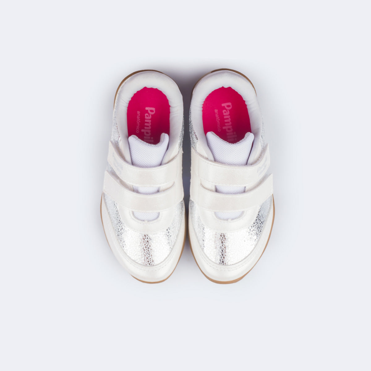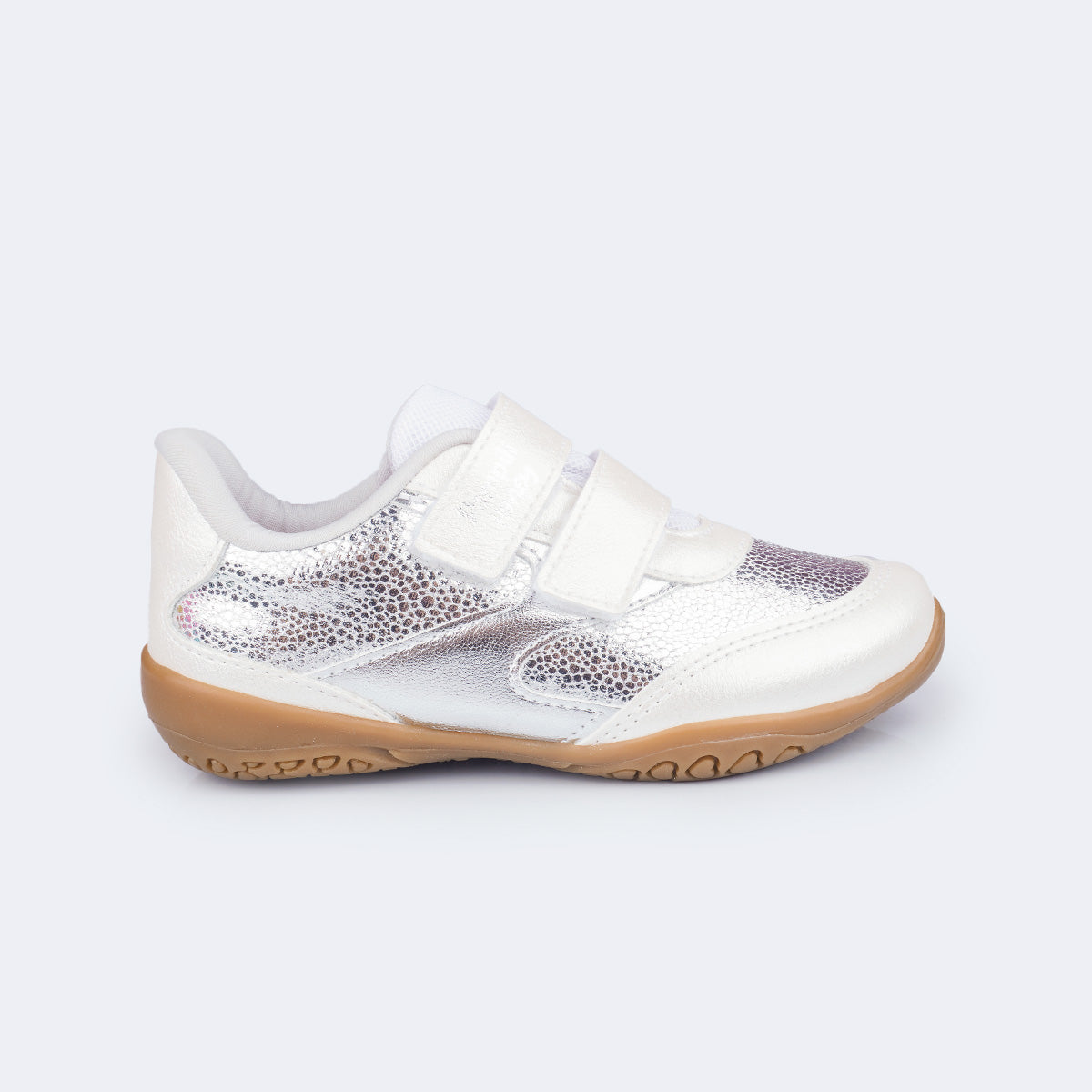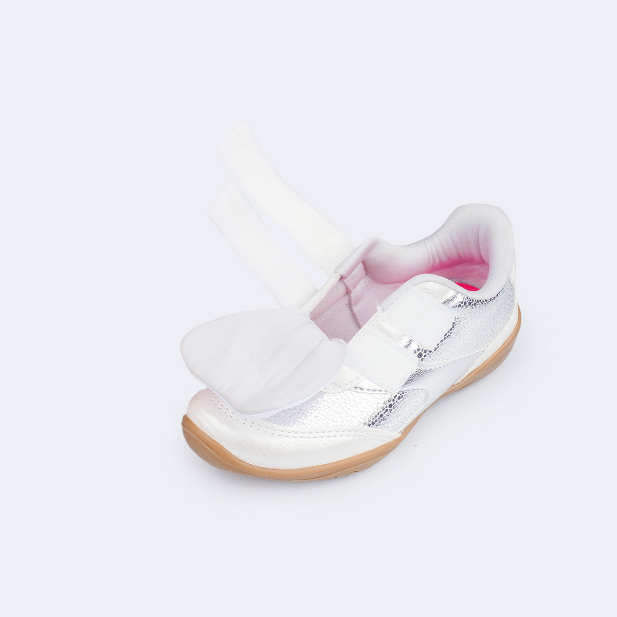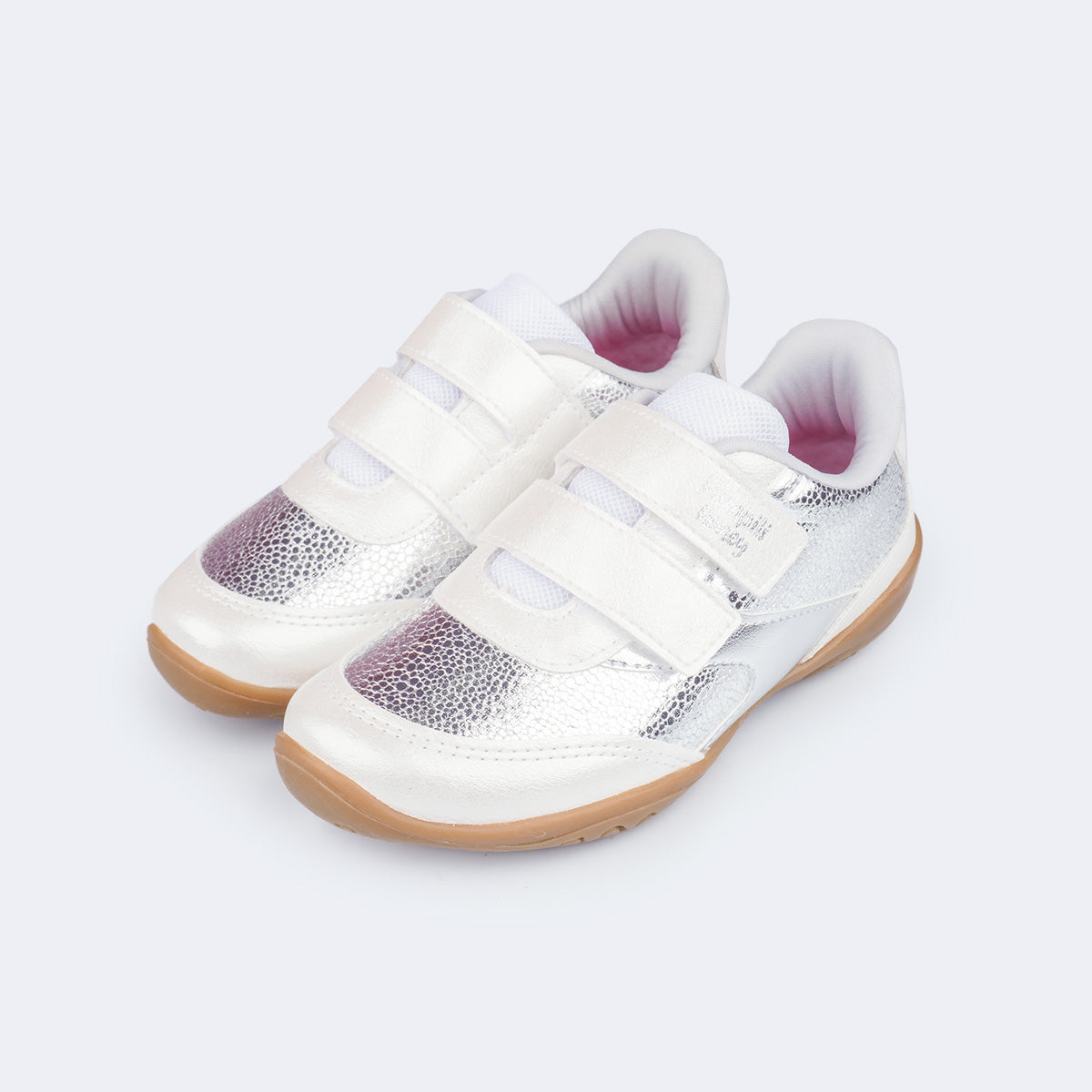 Conforto, praticidade e estilo em um só modelo! Este tênis infantil prata metalizado com recortes em branco perolado foi criado para acompanhar as meninas em todos os momentos do dia, unindo leveza, durabilidade e muito charme.