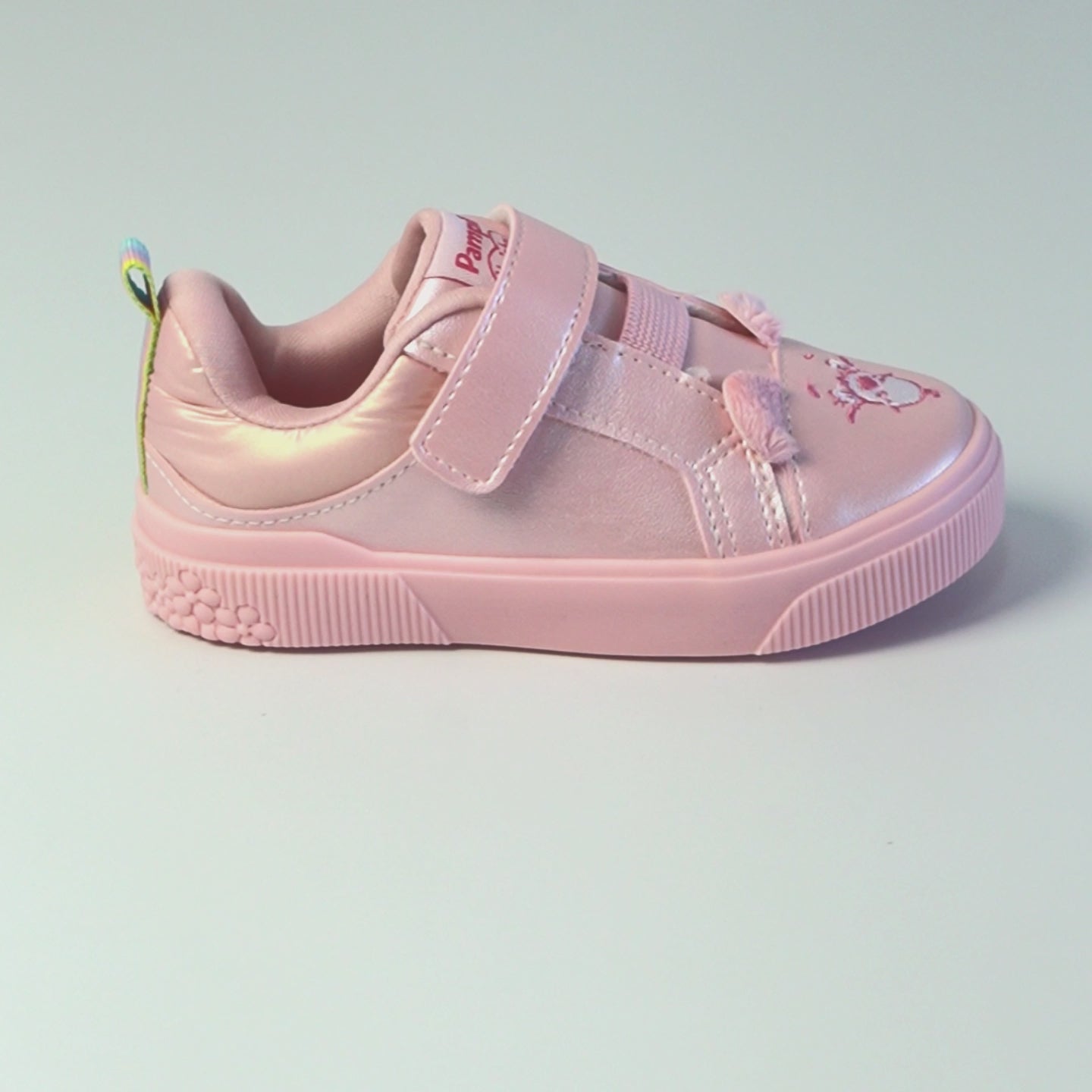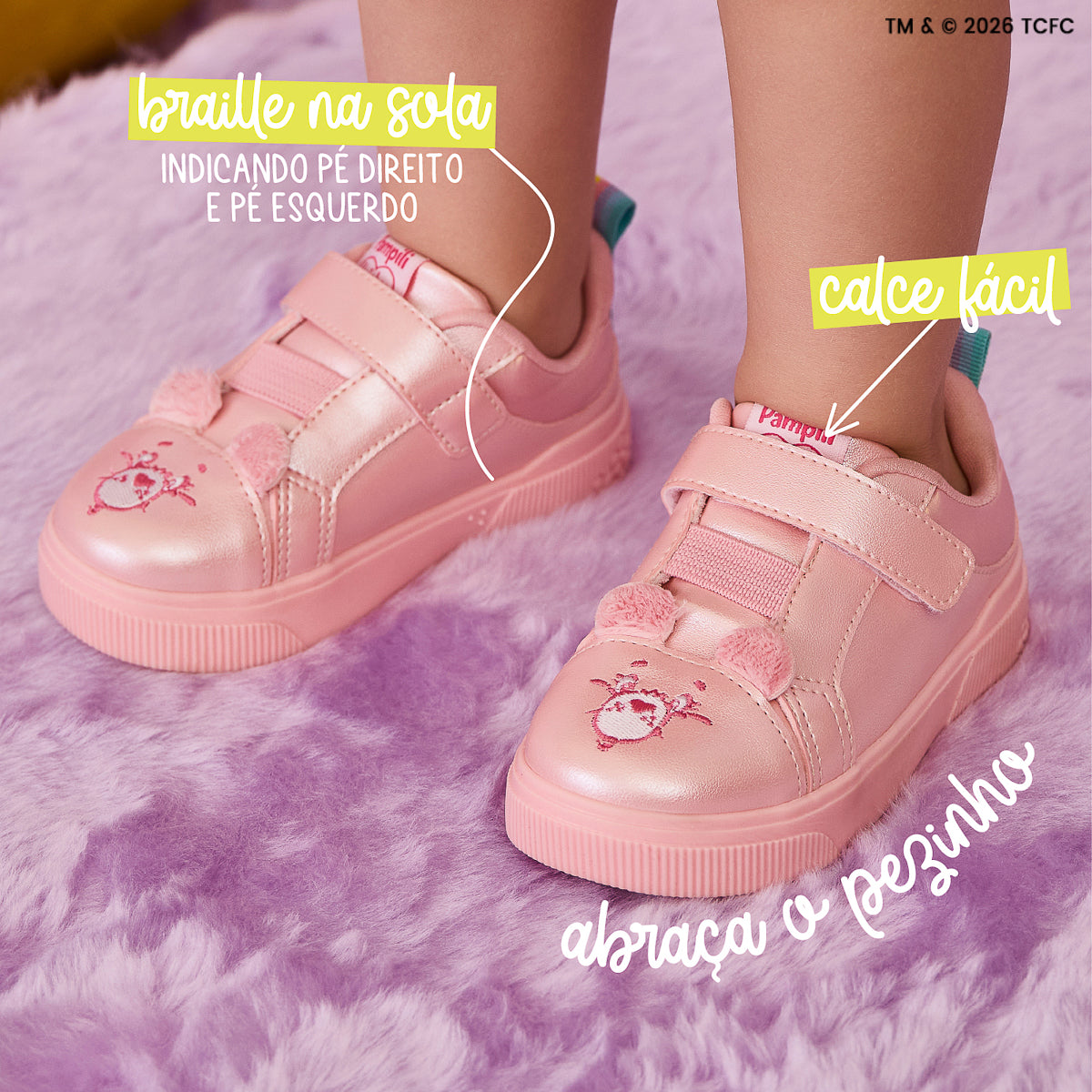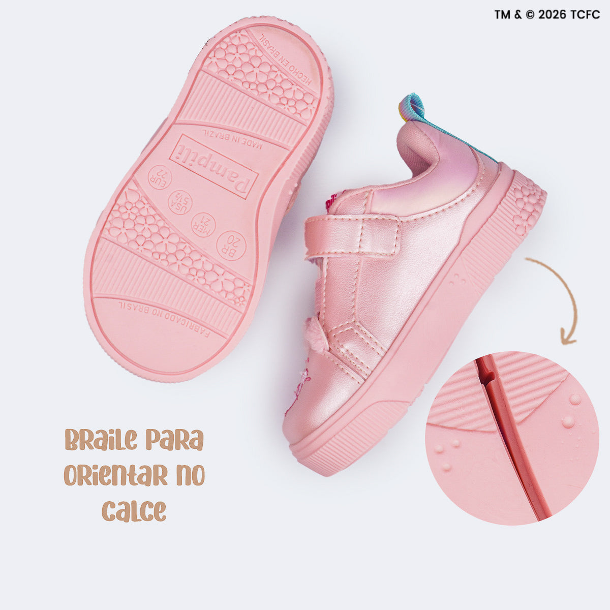 Com toda a sua doçura e cuidado, a Carinhosa inspira este tênis rosa perolado criado para envolver as meninas desde os primeiros passos. O modelo traz o rostinho da personagem bordado na parte frontal, com as orelhinhas macias em pelúcia que deixam o visual ainda mais delicado. O fecho de contato facilita o calce no dia a dia, oferecendo praticidade para os pais, enquanto o colarinho macio e a palmilha anatômica ajudam a manter os pezinhos super confortáveis. O solado caixa com estampa de flores em alto-relevo é antiderrapante, além de contar com identificação em braile, auxiliando na orientação do calce. Um tênis delicado, confortável e cheio de afeto, pensado para acompanhar cada descoberta das meninas.