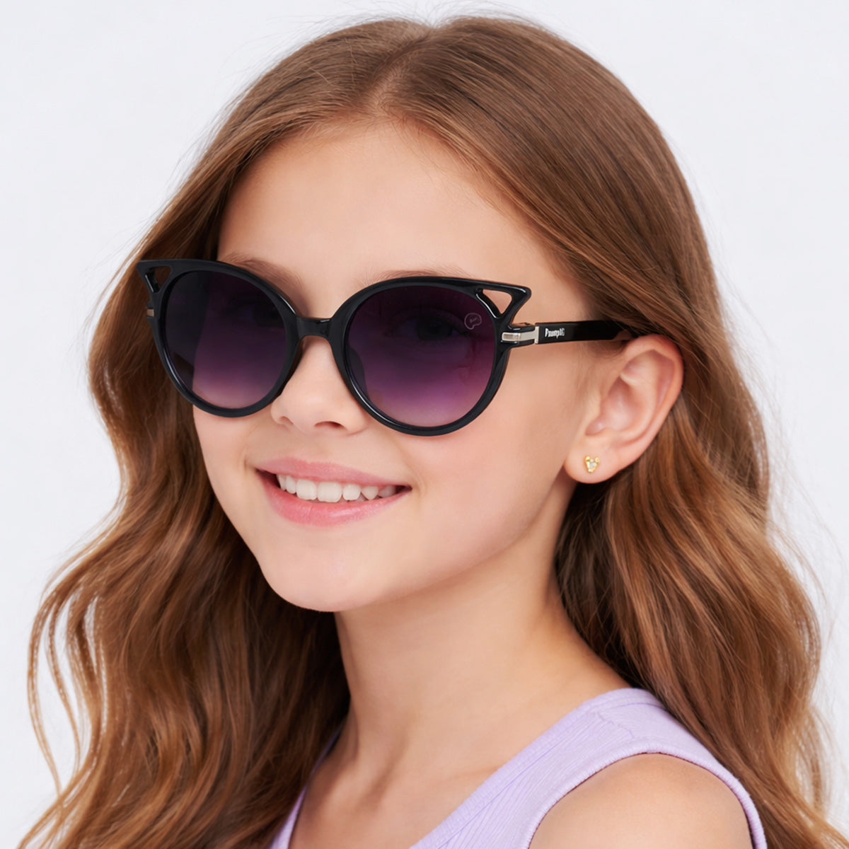 Óculos de sol infantil para menina em acetato preto, perfeito para compor looks estilosos e proteger os olhos das pequenas com muito charme. Com armação em formato estilo gatinho e lentes pretas degrdê, garante um toque moderno e versátil.