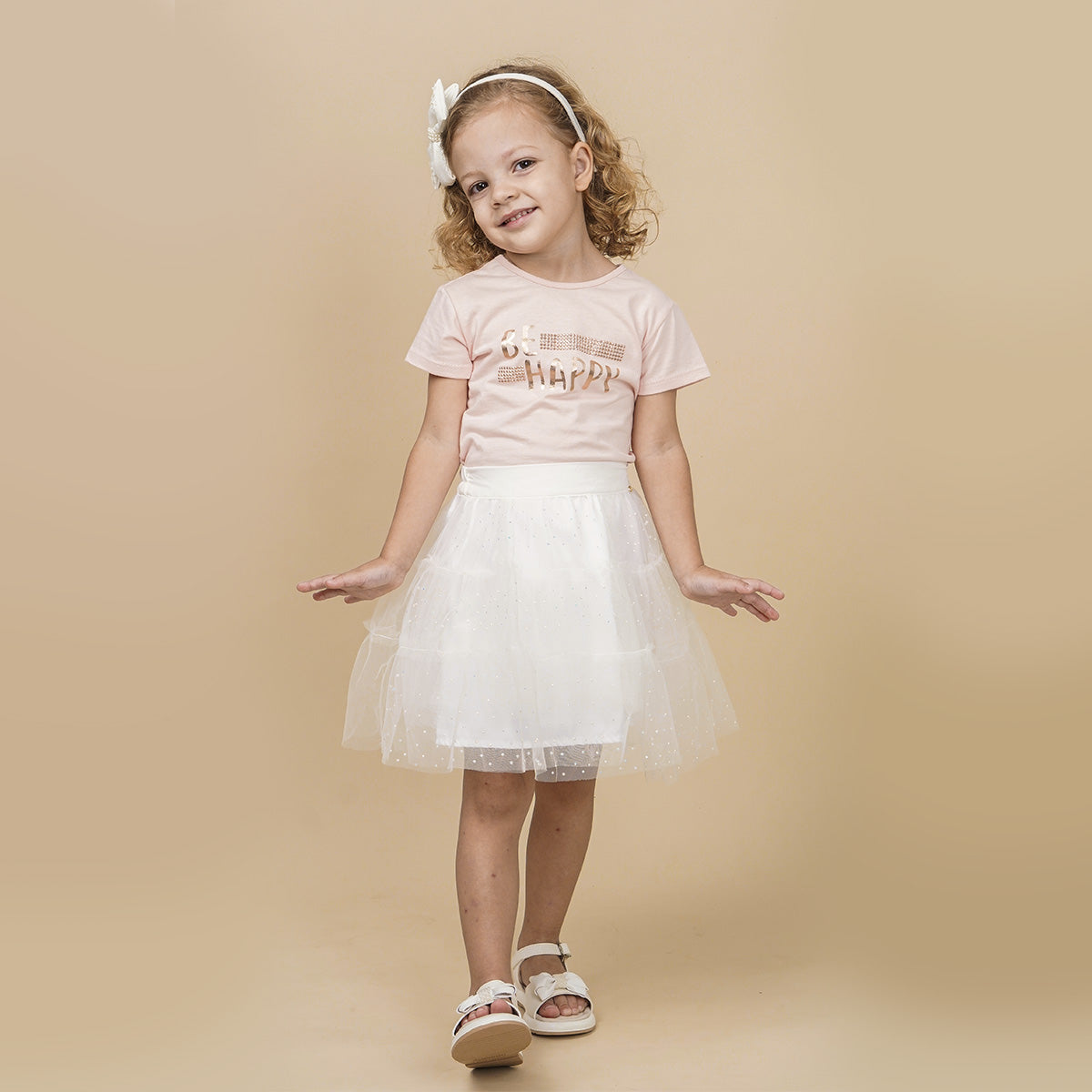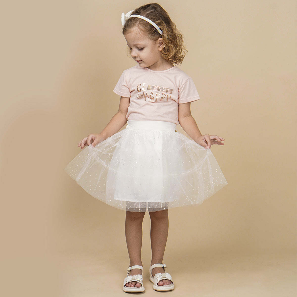 Saia infantil branca com camadas de tule e aplicações de hotfix furta-cor que criam um brilho delicado e encantador a cada movimento! Uma peça leve e fluida com forro suave, garantindo conforto durante o uso. O cós elástico ajusta perfeitamente ao corpo da menina, trazendo liberdade para brincar com estilo!
