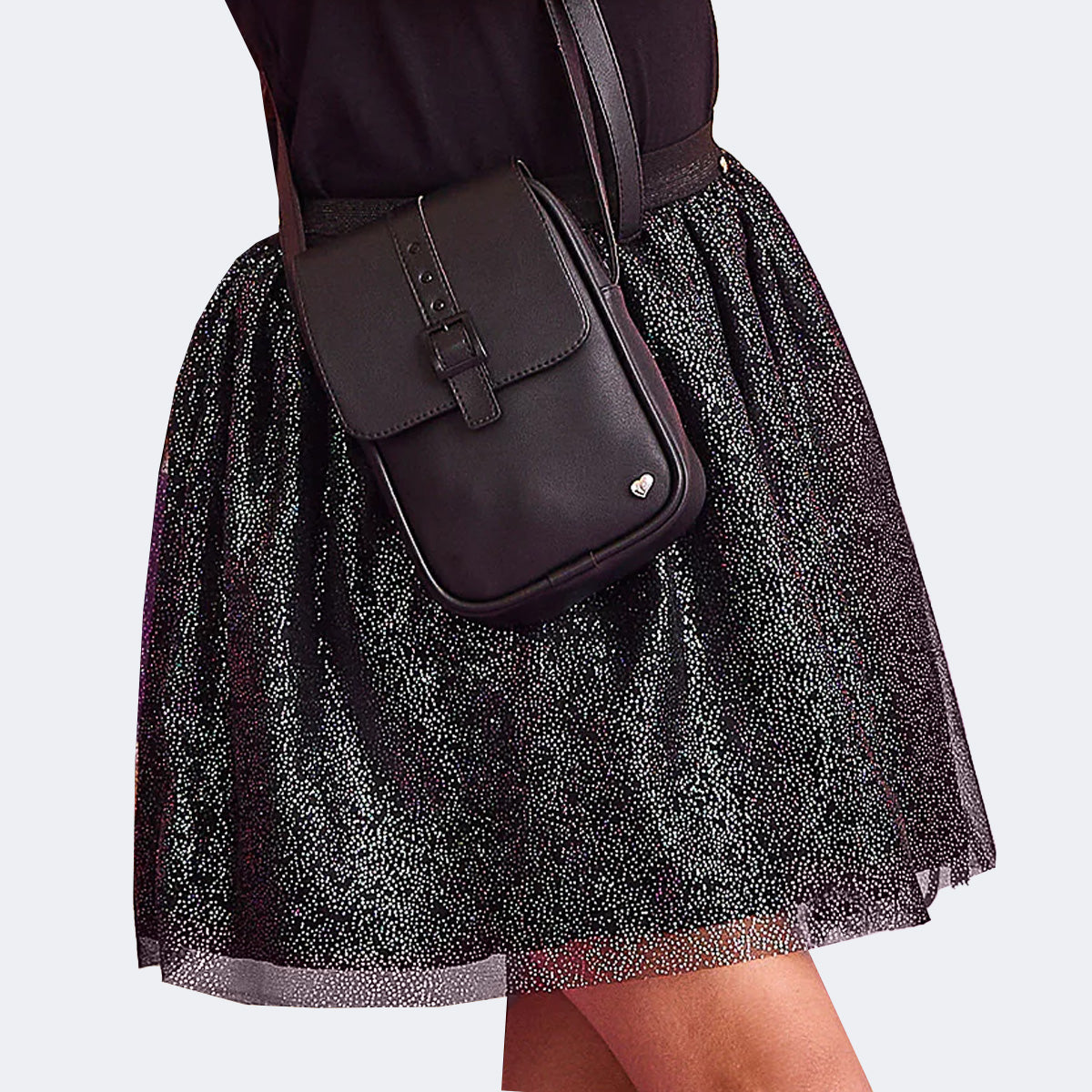 Saia infantil preta com sobreposição de tule brilhoso e pontos de luz furta-cor que criam um efeito mágico e encantador a cada movimento! O cós em elástico confortável garante ajuste perfeito ao corpo da menina, permitindo liberdade para brincar e se movimentar com muito estilo. A base forrada em algodão traz conforto para o uso no dia a dia ou em momentos especiais.