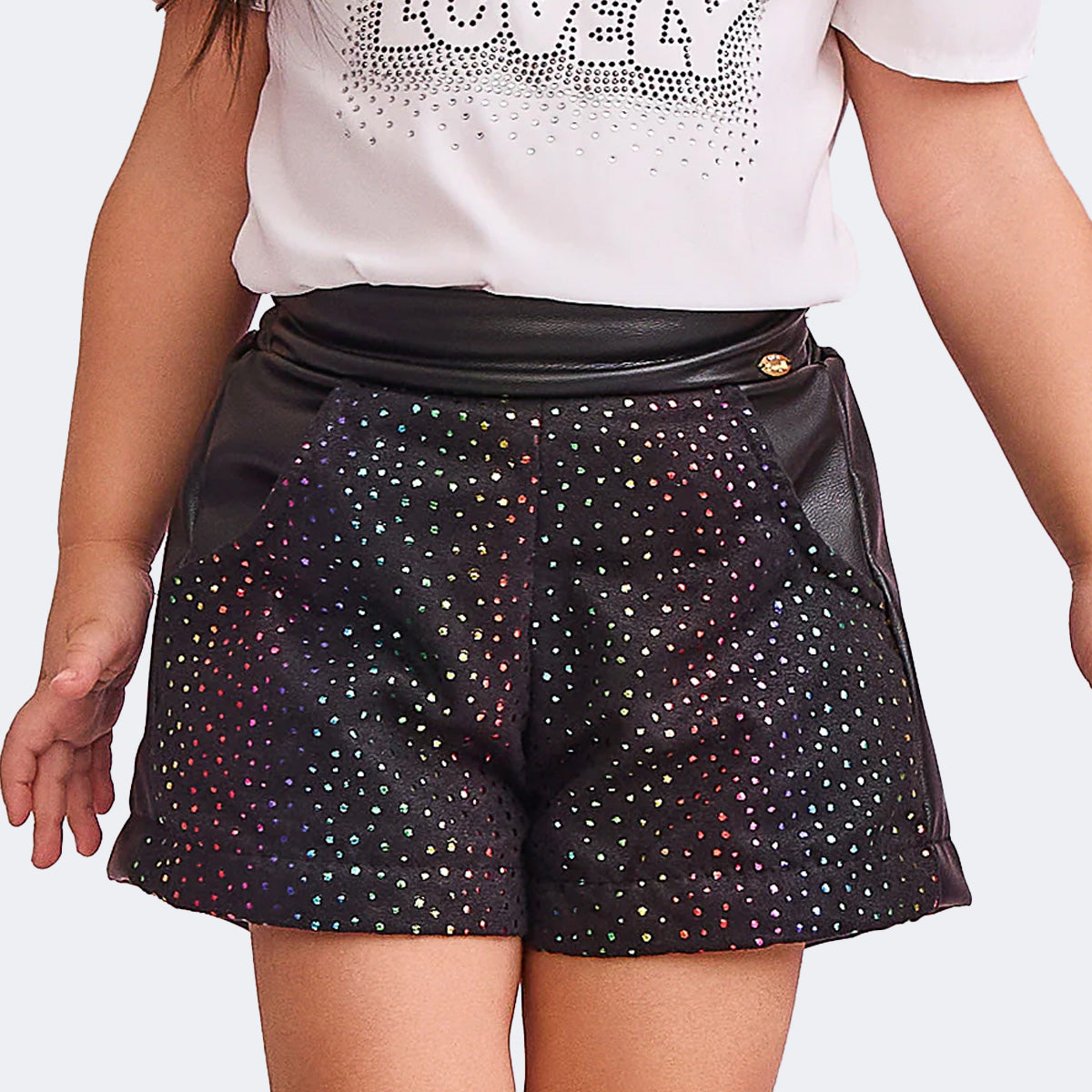 Short infantil preto com mix de materiais em PU e suede, ideal para criar looks casuais e cheio de personalidade! O detalhe na parte frontal em suede com aplicação de poás brilhosos e coloridos, formando um efeito vibrante. O modelo conta com bolsos funcionais e a etiqueta da marca em metal dourado no cós. Leve e confortável, esse short é perfeito tanto para o dia a dia quanto para eventos especiais.