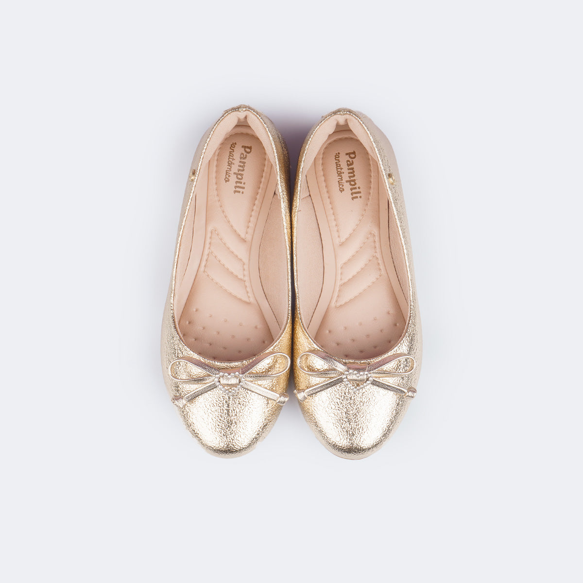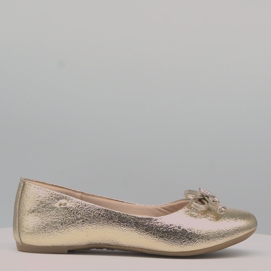 Encantadora e moderna, essa sapatilha infantil dourada é perfeita para compor looks despojados e confortáveis para as pequenas. Seu brilho metalizado traz um toque super atual, enquanto o laço na ponta com um adorno de coração em strass adiciona um charme delicado ao modelo.