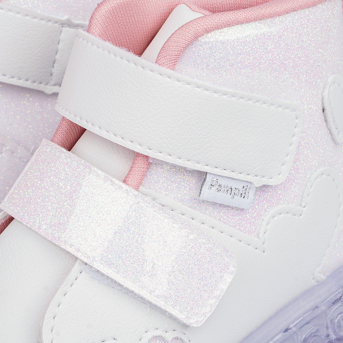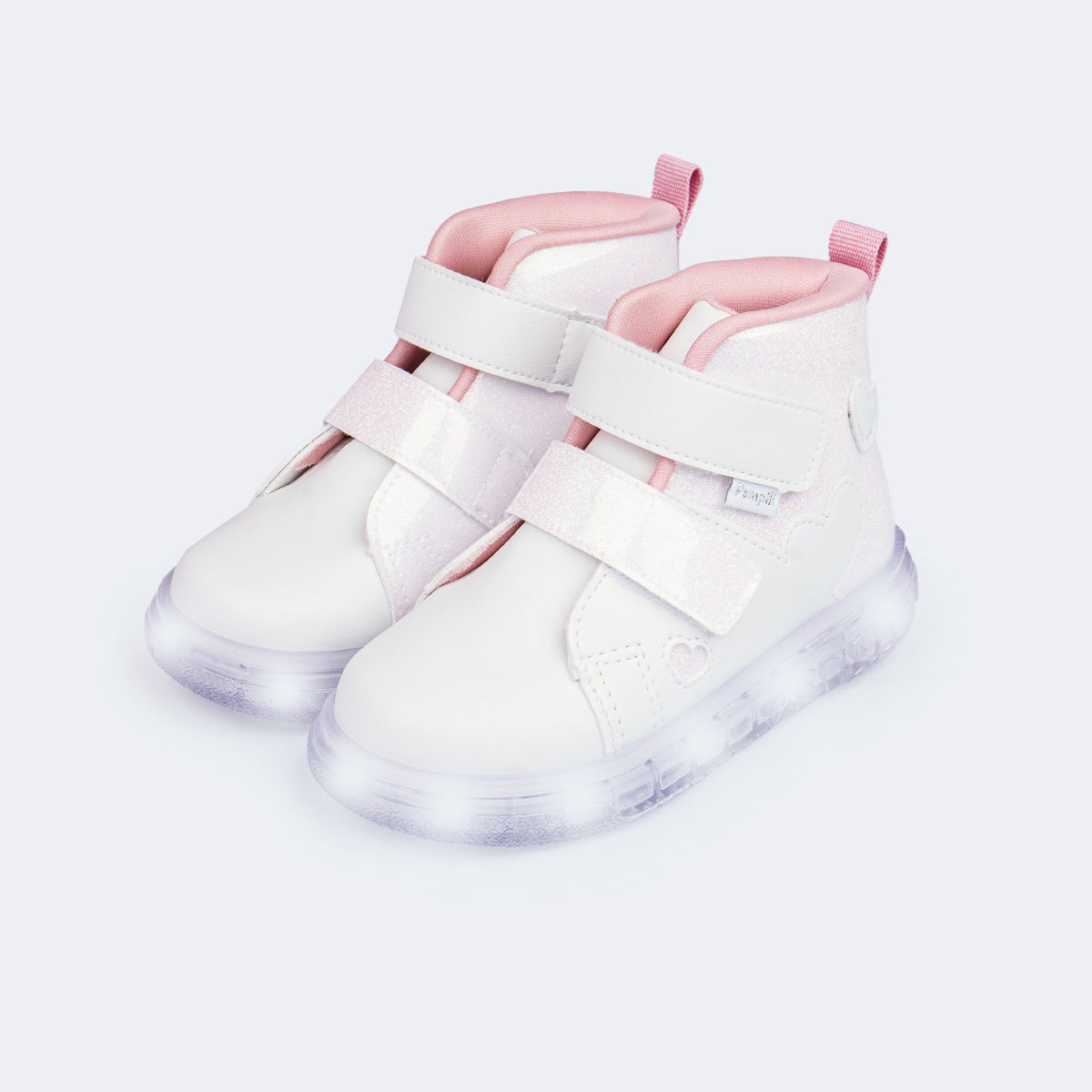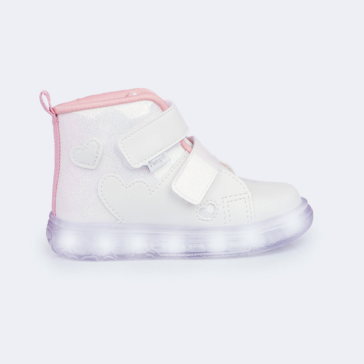 Para meninas que amam brilho, este tênis de LED cano médio branco, com glitter e recortes em corações é perfeito para passeios e rotina. O fecho de contato duplo facilita o calce e o material fácil de limpar ajuda na manutenção do uso diário.