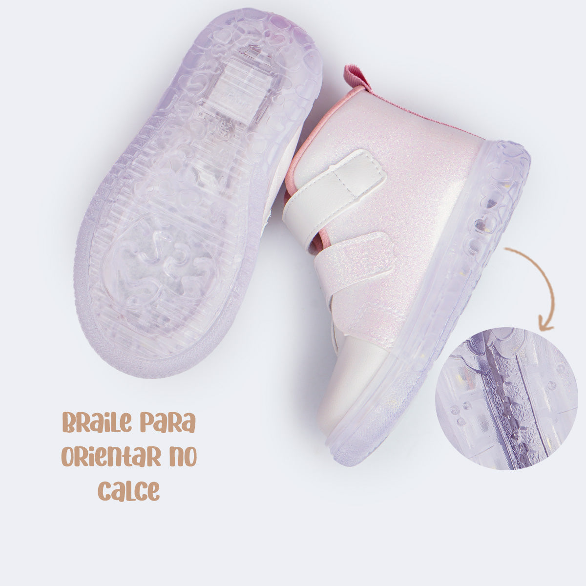 O design une conforto e segurança com palmilha anatômica, forro absorvente, colarinho comfy e solado antiderrapante transparente com luzes de led brancas que brilham a cada passo, além da orientação em braile no solado para apoiar meninas cegas ou com baixa visão.
