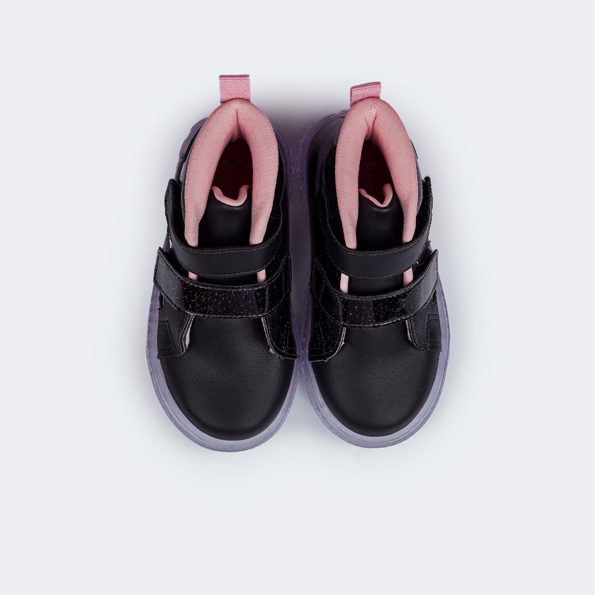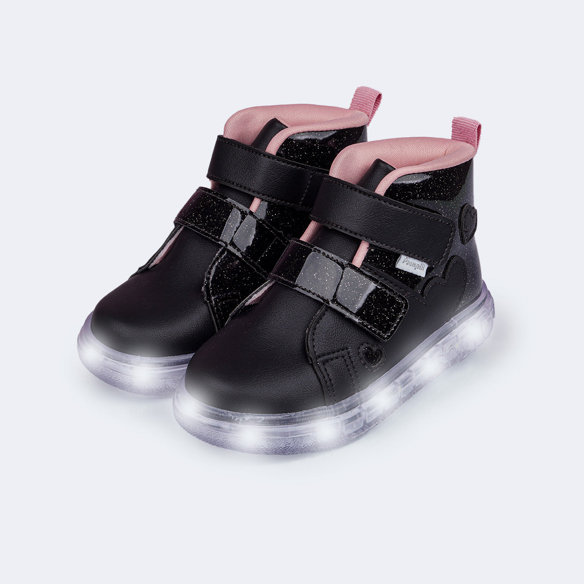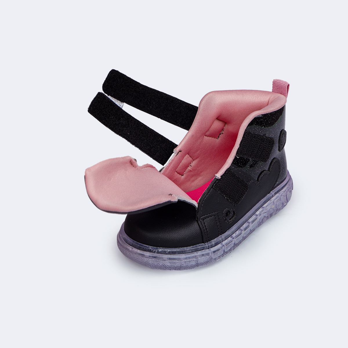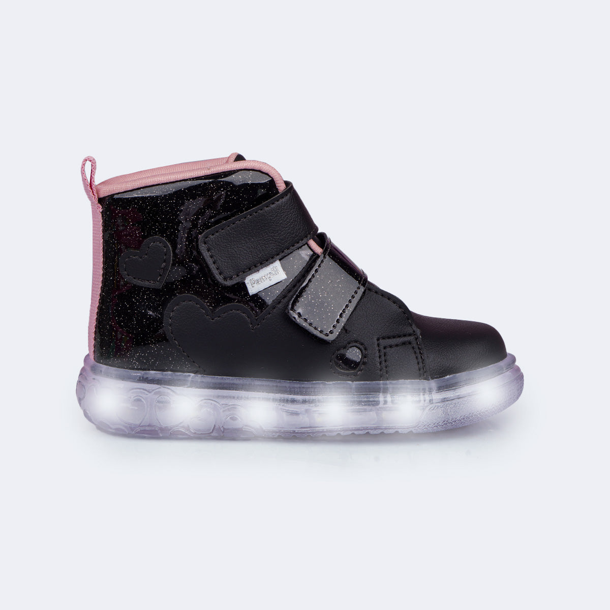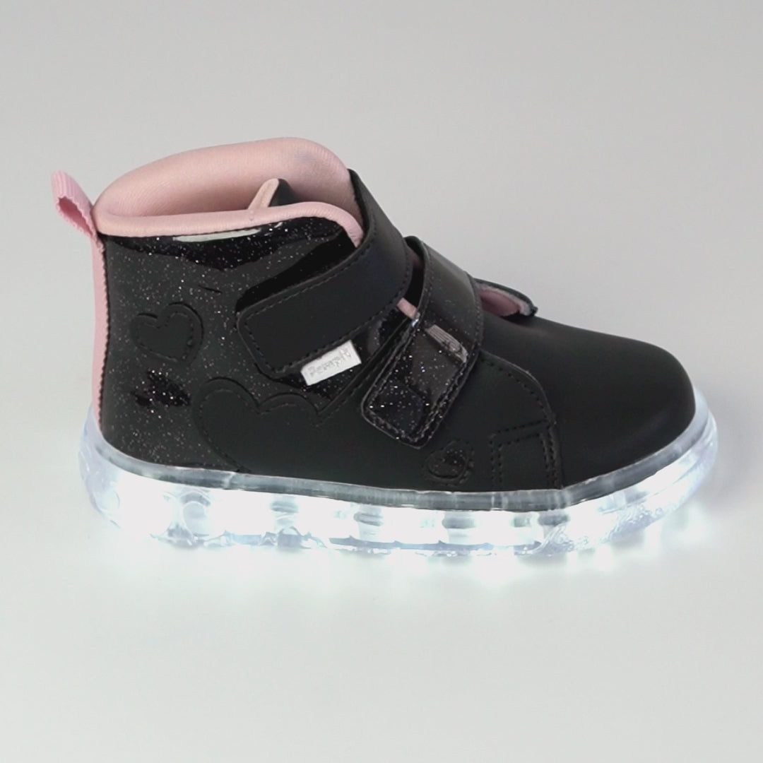 Para meninas que amam brilho, este tênis de LED cano médio preto, com glitter e recortes em corações é perfeito para passeios e rotina. O fecho de contato duplo facilita o calce e o material fácil de limpar ajuda na manutenção do uso diário.