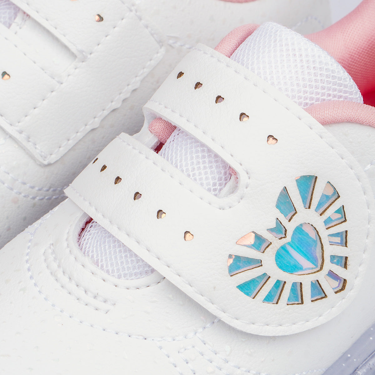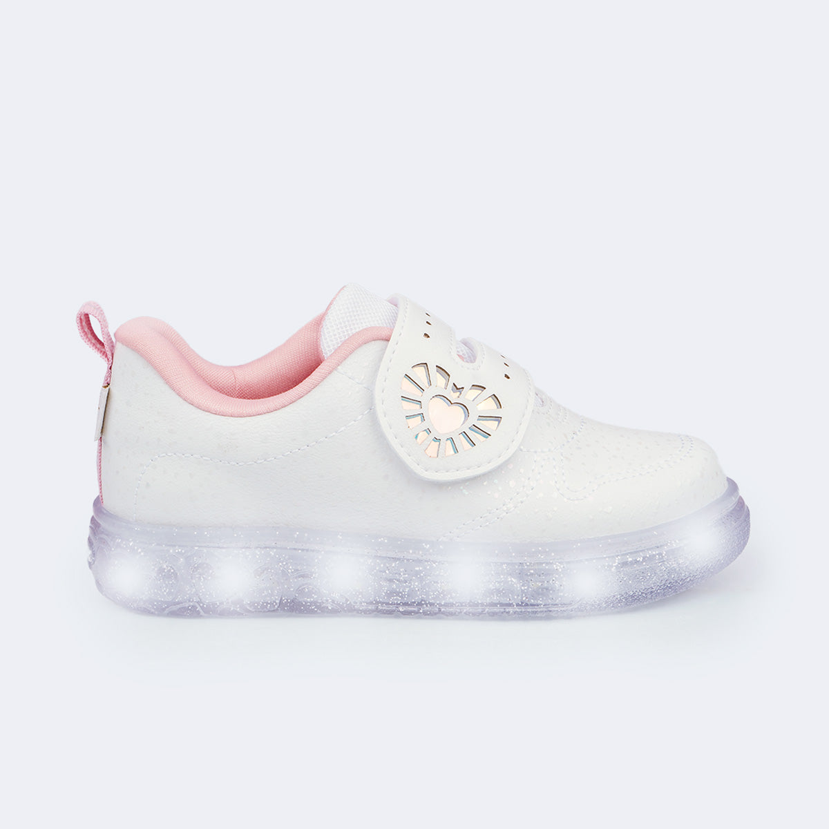 Delicado e cheio de estilo, esse tênis de led infantil branco é perfeito para iluminar os looks das pequenas. O recorte lateral holográfico em formato de coração junto com as luzes de led do solado tornam o design fashion e divertido.