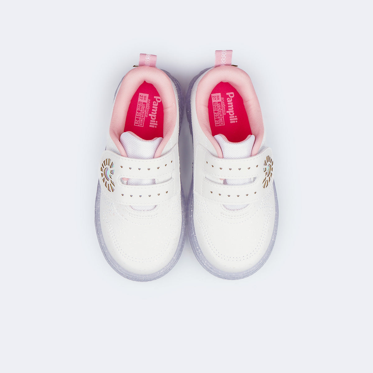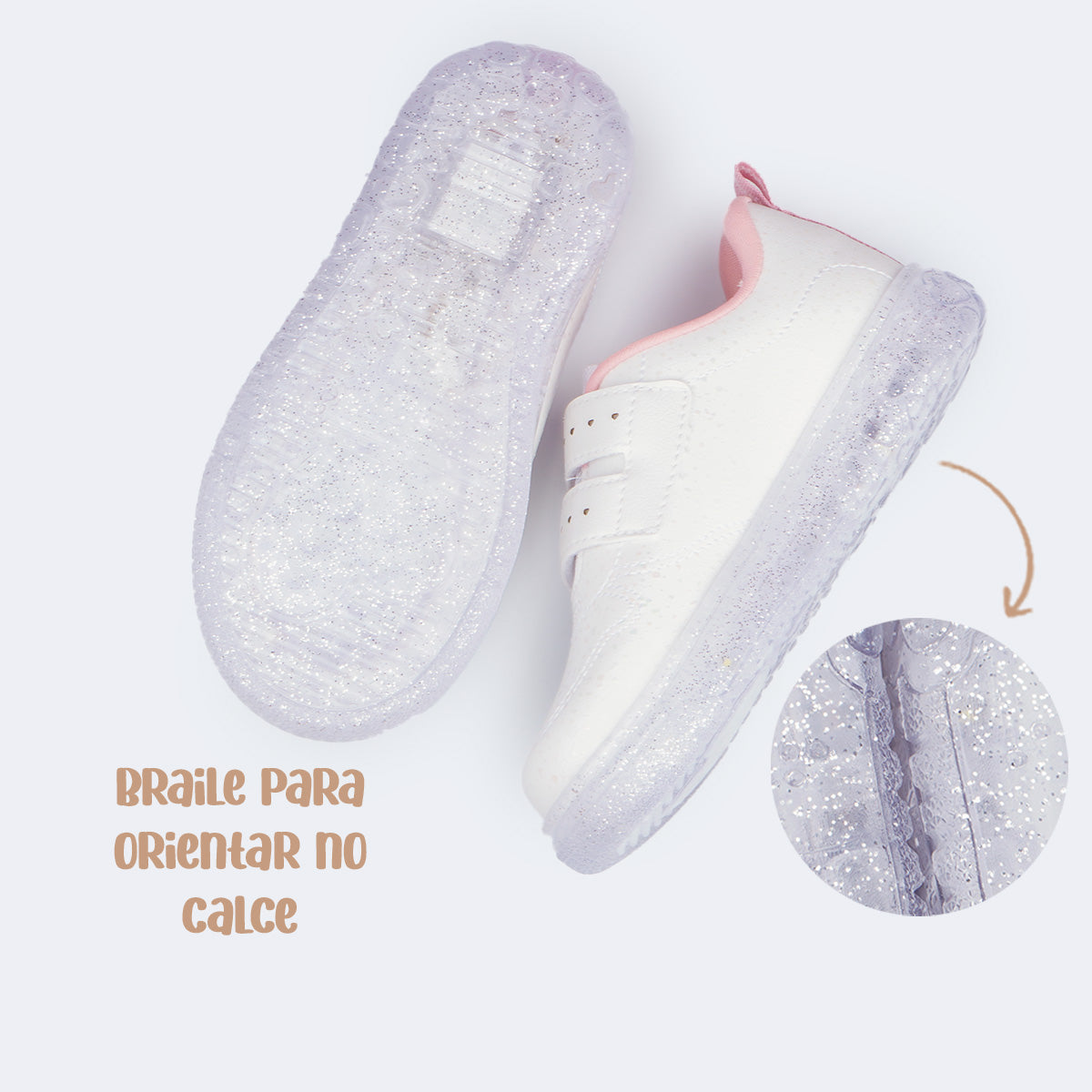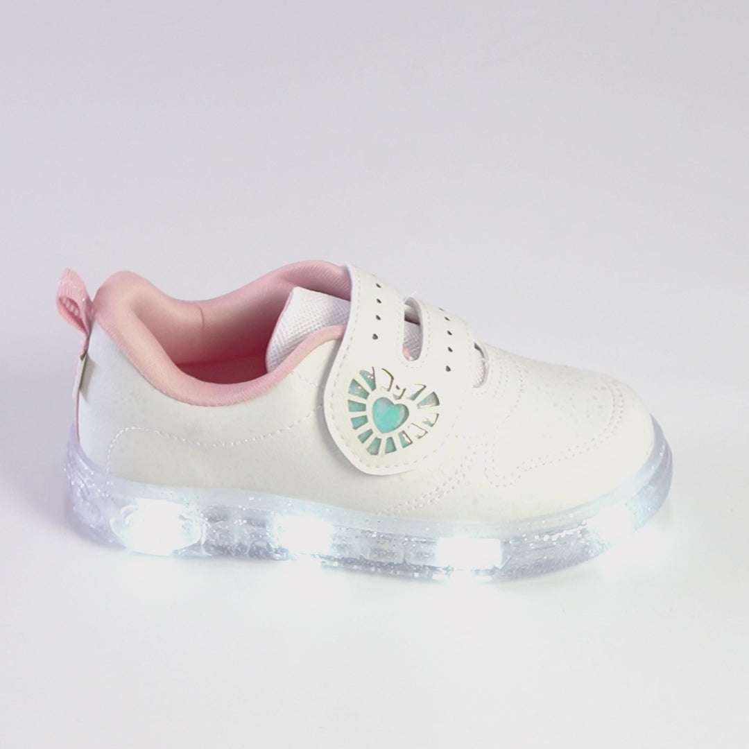 O modelo possui fechamento de contato que proporciona um calce fácil e prático para o dia a dia, forro macio absorvente de suor, palmilha anatômica e solado transparente com glitter, antiderrapante e com LEDs brancos que acendem em diferentes sequências, tornando cada passo cheio de luz.