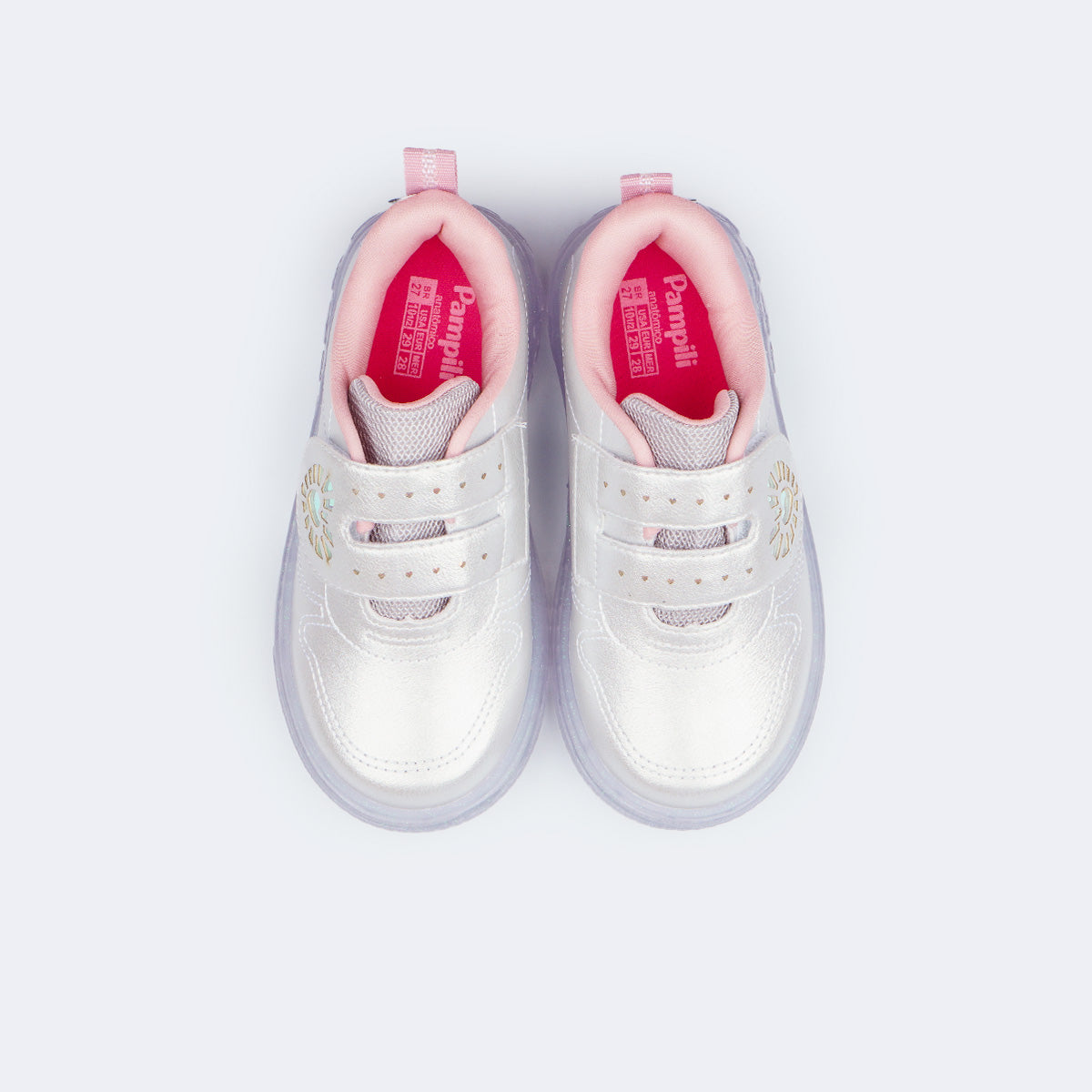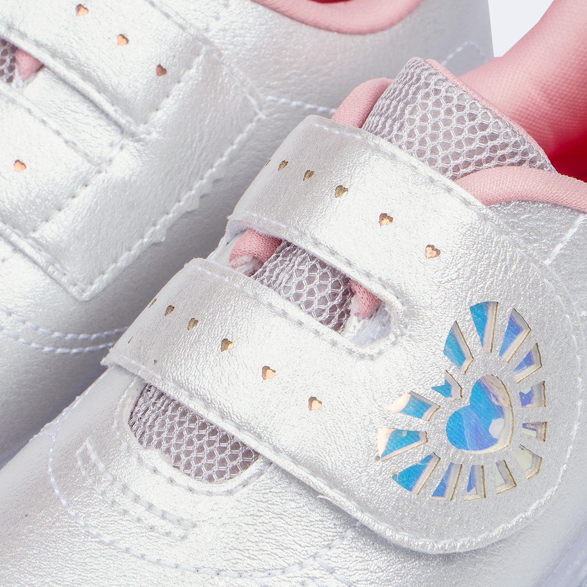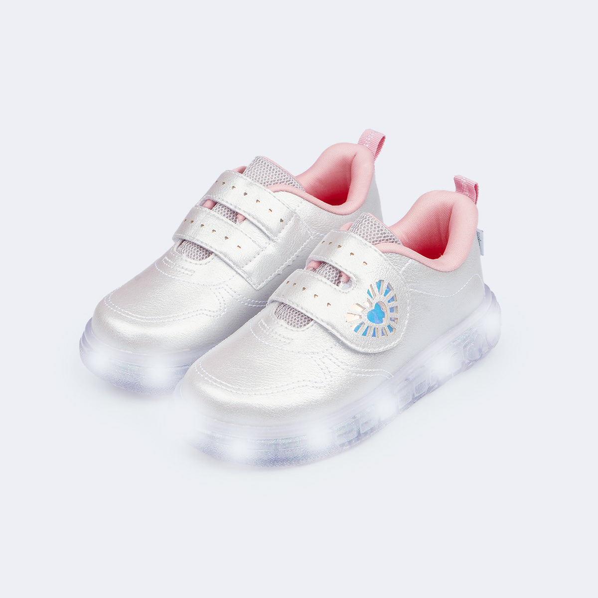 Delicado e cheio de estilo, esse tênis de led infantil prata é perfeito para iluminar os looks das pequenas. O recorte lateral holográfico em formato de coração junto com as luzes de led do solado tornam o design fashion e divertido.