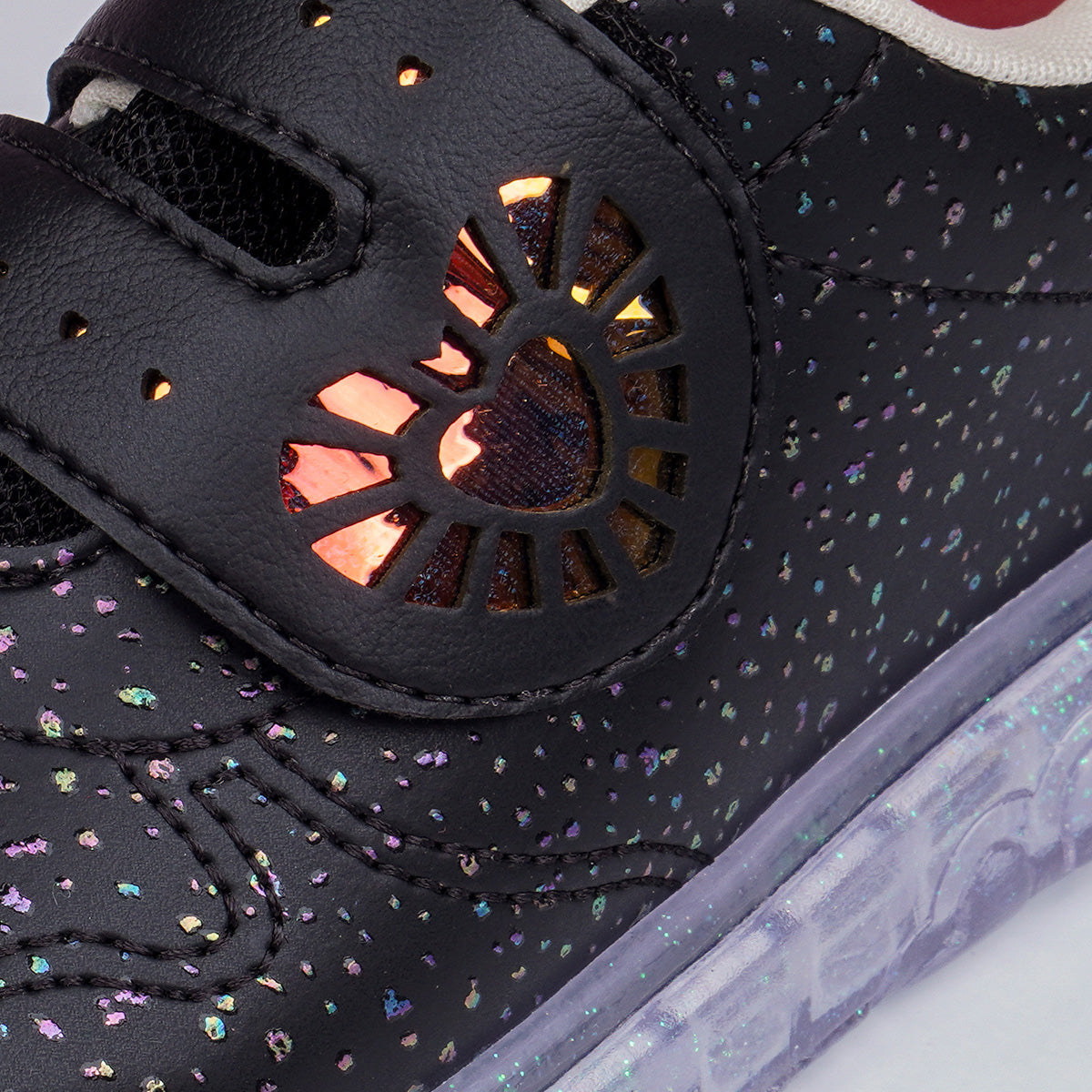 Delicado e cheio de estilo, esse tênis de led infantil preto é perfeito para iluminar os looks das pequenas. O recorte lateral holográfico em formato de coração junto com as luzes de led do solado tornam o design fashion e divertido.
